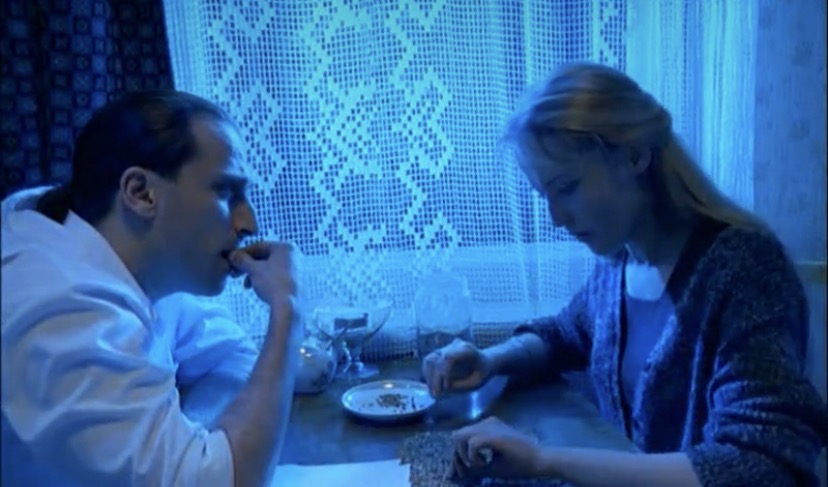 Формально герои диалога говорят о детстве, о каких-то вроде бы бытовых вещах. Он говорит про лодку, которую друг проколол ножом из зависти, про слёзы, про то, что это до сих пор внутри. Она рассказывает про компот в портфеле и сотрясение мозга у одноклассника, без эмоций и сожаления, как о чём-то само собой разумеющемся, перебирая гречку.