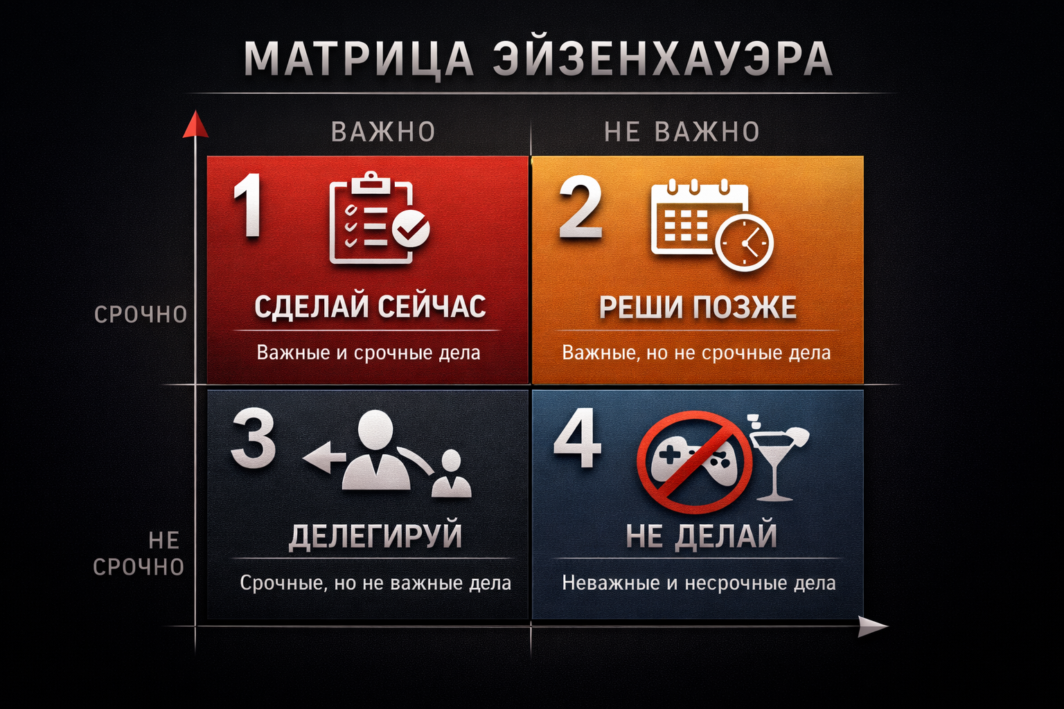 Позже этот принцип оформили в схему из четырёх секторов по двум критериям: важность и срочность. Матрица не решает за человека, что делать, но показывает, где именно он приоритетно тратит свою энергию.