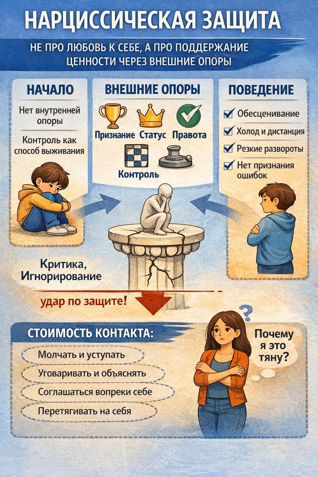 На днях была на онлайн-встрече с Юлией Пирумовой, автором книги Хрупкие люди Меня зацепила одна простая, но редкая позиция: попытка не клеймить, а разбирать. В её оптике нарциссизм — это не ярлык и не характеристика плохого человека, не обзывательство, а способ, которым человек удерживает себя в жизни. Если говорить без упрощений, нарциссические защиты — это не про слишком любить себя. Это отсутствие устойчивого ощущения собственной ценности внутри. Когда этого нет, опора выносится наружу: в признание, в статус, в контроль, в ощущение правоты. И тогда любое столкновение — критика, игнорирование, несогласие — воспринимается не как часть нормального взаимодействия, а как угроза самому себе. Отсюда и то, что обычно называют поведением нарцисса: обесценивание, холод, резкие изменения в контакте, невозможность признать ошибку. Но важно понимать: в этот момент речь не про другого человека. Речь про попытку удержать себя. Человек — объект разворачивающейся картины, но не ее субъект. Есть ещё одна вещь, которая часто теряется в обсуждениях. Эти механизмы есть у всех. Вопрос не в наличии, а в том, насколько они становятся единственным способом существовать. Когда у человека есть несколько опор, защита остаётся гибкой. Когда нет, она становится жёсткой и начинает определять весь способ контакта. Формируется это не случайно. Там, где ценность себя была условной, нужно было соответствовать, угадывать, заслуживать. Или там, где мир был непредсказуемым, и контроль становился единственным способом не распасться. Психика в этом месте не то чтобы ломается, она решает задачу выживания теми средствами, которые доступны, а соответственно у этой психики формируется некое содержание, призма, через которую видно мир Частый, кстати, вопрос: если внутри столько неустойчивости, почему такие люди так притягивают? Потому что они умеют создавать впечатление. Быстро считывают ожидания, попадают в них, дают ощущение включённости и значимости. Рядом с ними легко почувствовать себя особенным. Это не наивность — это нормальная реакция на сильный и так нужный отклик. А вот дальше меняется сама логика контакта. Там, где сначала было «кайф, меня видят», постепенно появляется «мне нужно это удержать, я не могу это потерять». Если вы склонны сглаживать, подстраиваться, объяснять и брать на себя больше, чем берёт другой, эта связка закрепляется. Один удерживает себя через признание и контроль, второй через сохранение отношений. В какой-то момент вы обнаруживаете, что живёте внутри чужой системы удержания. Чтобы это не оставалось сухой теорией, есть смысл смотреть не на другого, а на себя в этом взаимодействии. Что вы делаете, когда становится сложно? — замолкаете, чтобы избежать конфликта — объясняете по кругу, надеясь быть услышанным — соглашаетесь, хотя внутри нет согласия — берёте на себя больше, чтобы не развалилось И следующий вопрос — зачем? Попытка объяснить, доказать, донести как есть на самом деле, некую правду, редко приводит к результату. Чем больше усилий вкладывается в это, тем сильнее с другой стороны включается защита. Тогда остаётся более прямой вопрос: за счёт чего вообще держится этот контакт? Если за счёт того, что вы регулярно сдвигаете себя, сжимаете, отменяете — это уже не просто сложный период, это способ существования отношений. Здесь есть непр