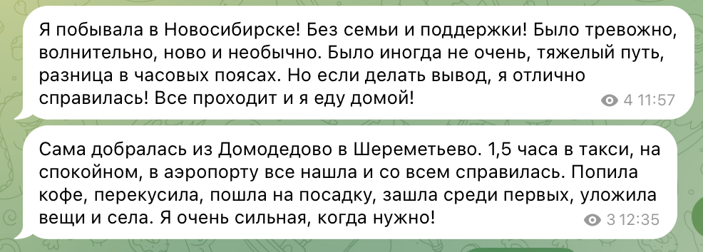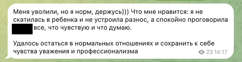 1️⃣ Канал в телеграм в одно лицо, моё, естественно. Без доступа для посторонних. Там я регулярно стараюсь отмечать свои успехи: просто быстренько записываю, с чем смогла справиться, сделала, но боялась. Или больно упала, но поднялась. Написала, отправила сообщение в свой канал. Всё.