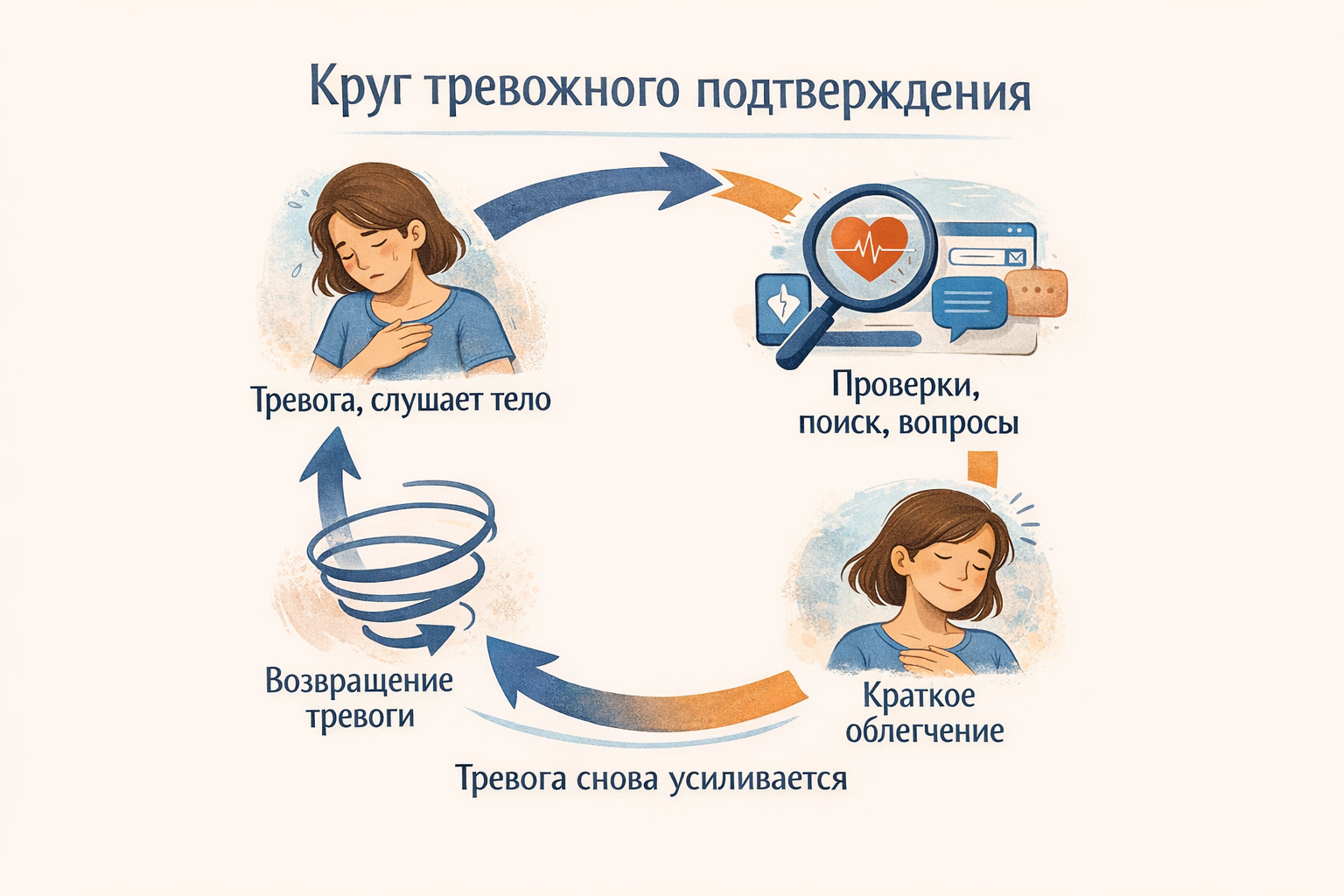 Постепенно любые такие действия — измерения давления/пульса/оксигенации, поиск информации, расспросы в чатах, сравнение симптомов - начинают выполнять одну функцию: ненадолго снижать напряжение, и именно это делает их частью тревожного круга. Человек ищет не смысл и не диагноз, а облегчение. Оно приходит, но ненадолго, и тревога возвращается с новой силой. Так формируется привычка реагировать на тревогу через проверки и подтверждения.
