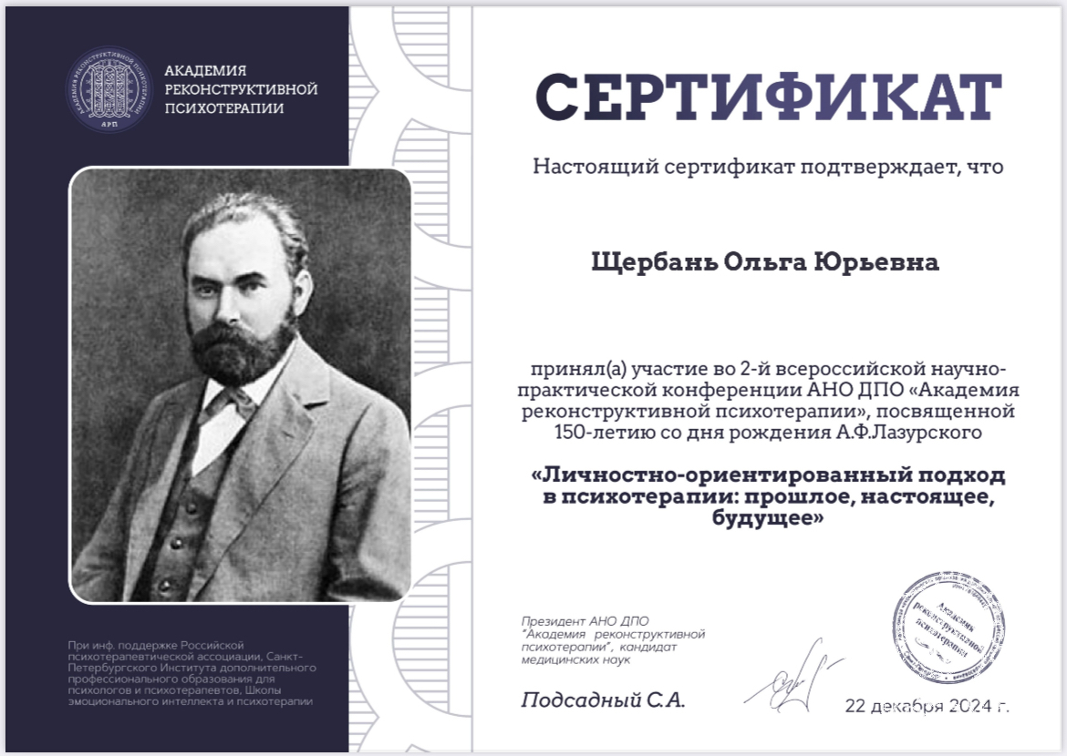 В 2018 году я прошла сертификацию тренера по развитию эмоционального интеллекта, получив в том же году звание ТОП-3 тренера страны по версии Всероссийского ежегодного мероприятия “Инфоконференция -2018” г. Москва.