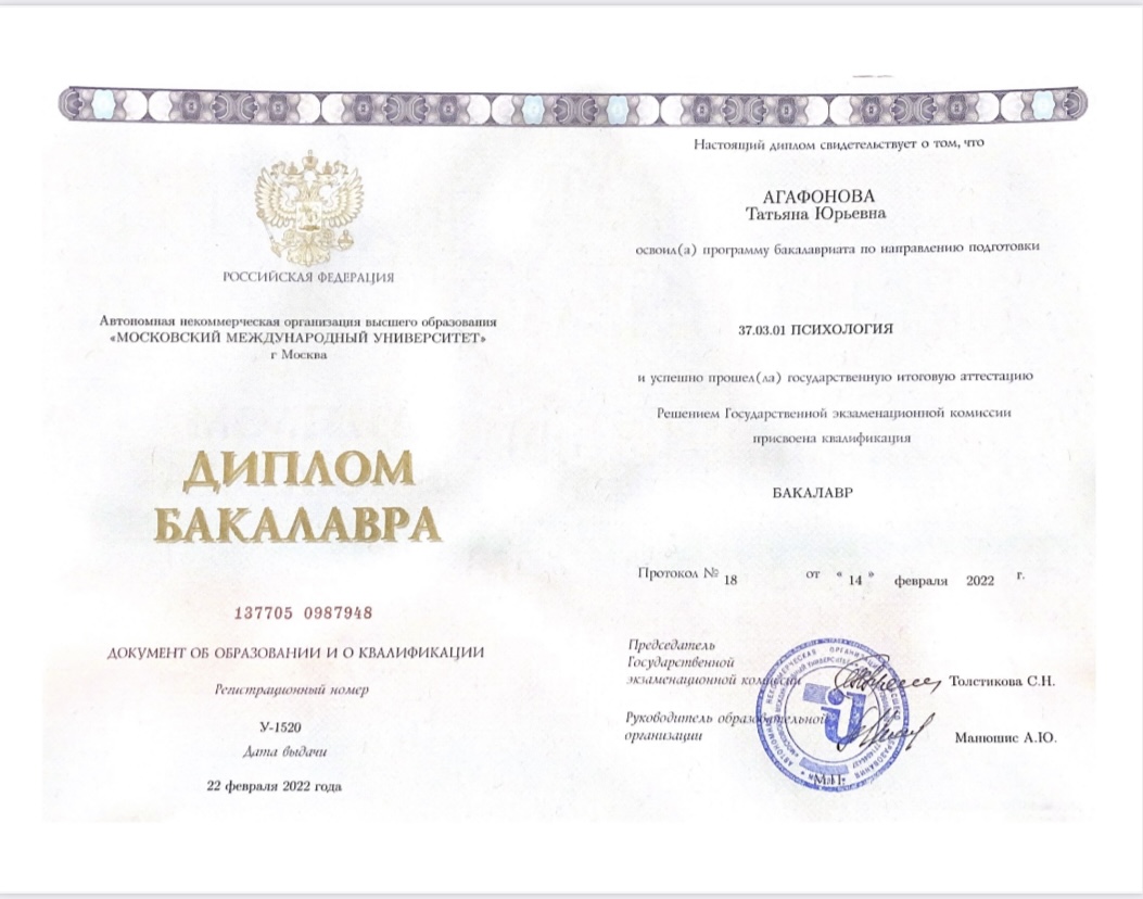 ⚪️ Высшее психологическое образование АНОВО «Московского Международного Университета» г. Москвы;