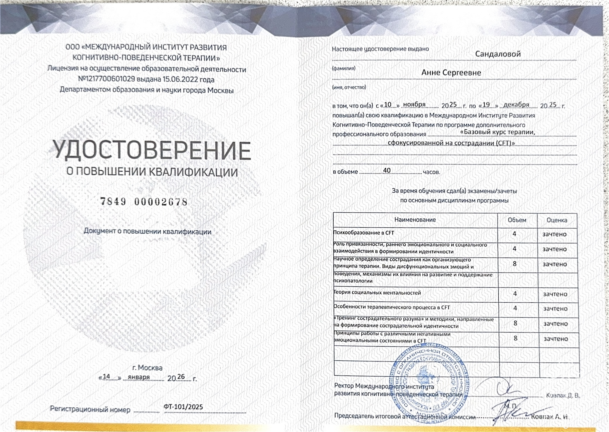 Работаю в научно-обоснованных методах психотерапии, использую КПТ (когнитивно-поведенческая психотерапия), АСТ (терапия принятия и ответственности), CFT (терапия сфокусированная на сострадании).