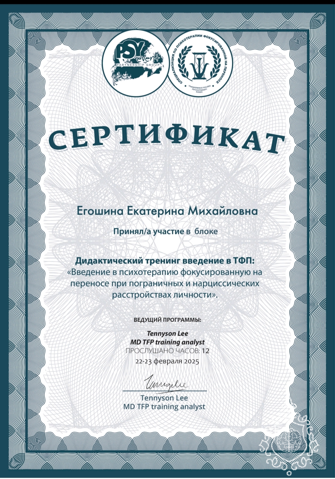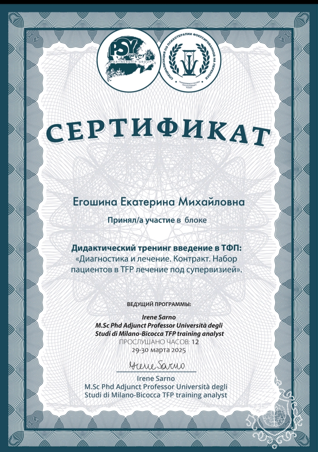 Являюсь членом РОТФП (Русскоязычного общества терапии фокусированной на переносе).