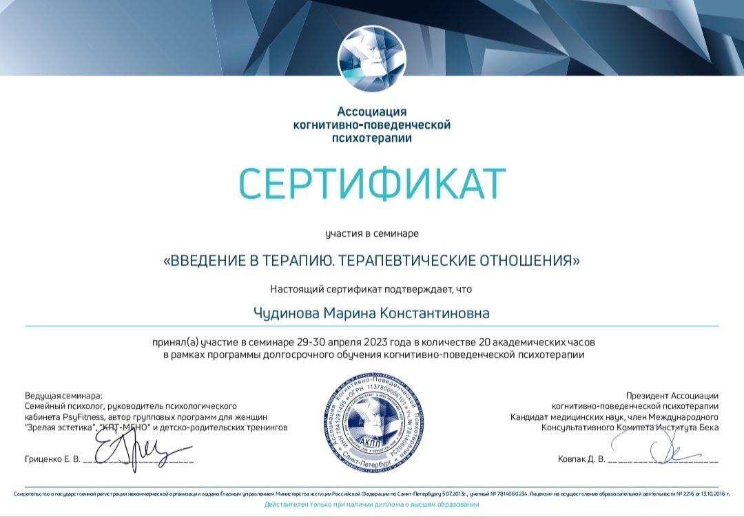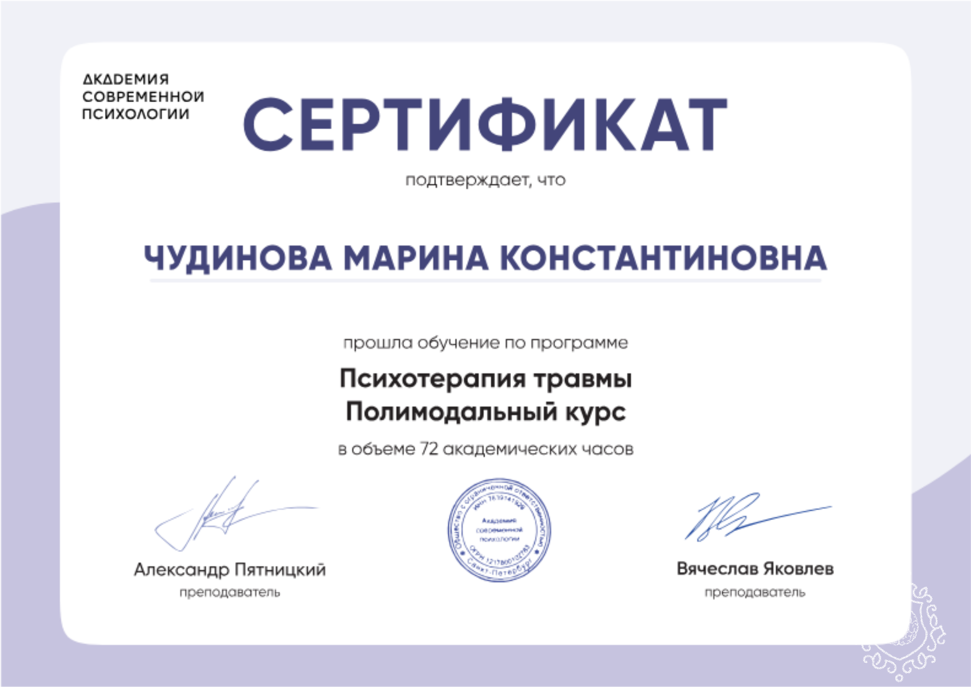В феврале 2024-го года прошла курс по повышению квалификации "Психотерапия комплексной травмы".