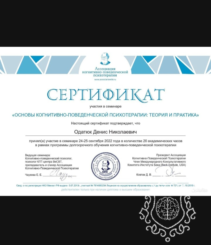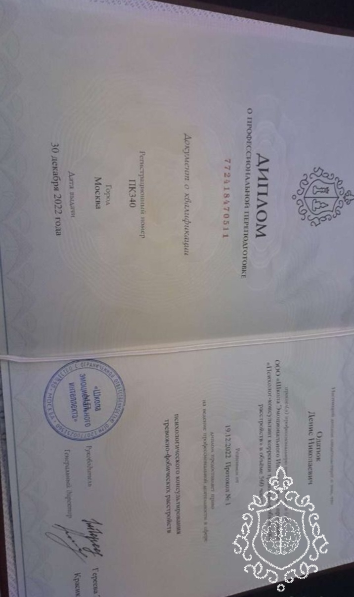 Привет! Меня зовут Денис! Я психолог-консультант специалист по работе с тревожно-фобическими расстройствами, выпускник Школы Эмоционального Интеллекта и психотерапии. Я когда-то сам столкнулся с симптомами ВСД, паническими атаками и фобиями! Долго не понимал что со мной происходит, прошёл много психологов, прошёл через антидепрессанты и госпитализации многократные в отделение неврозов. После обучения в ШЭИ, я понял, что со мной происходило! И теперь я точно знаю, как помочь другим людям , столкнувшемся со своим неврозом!