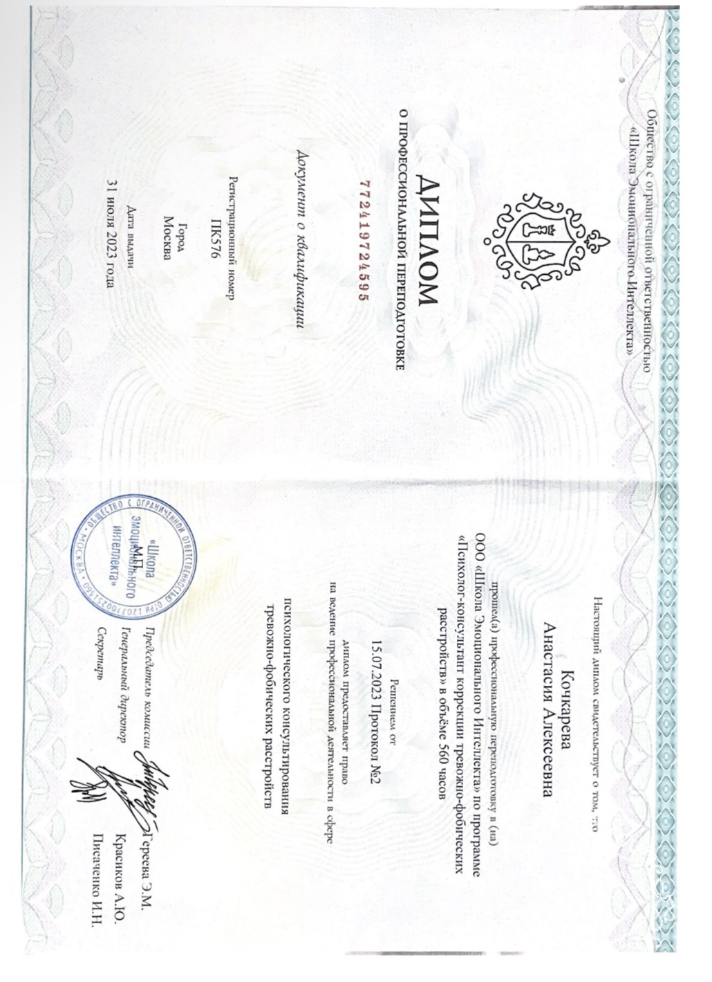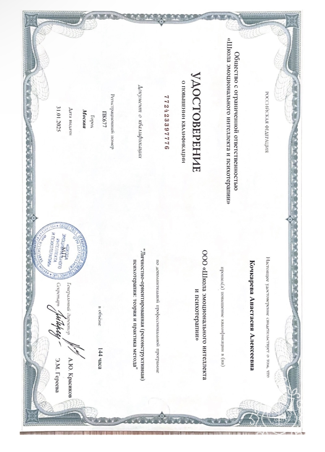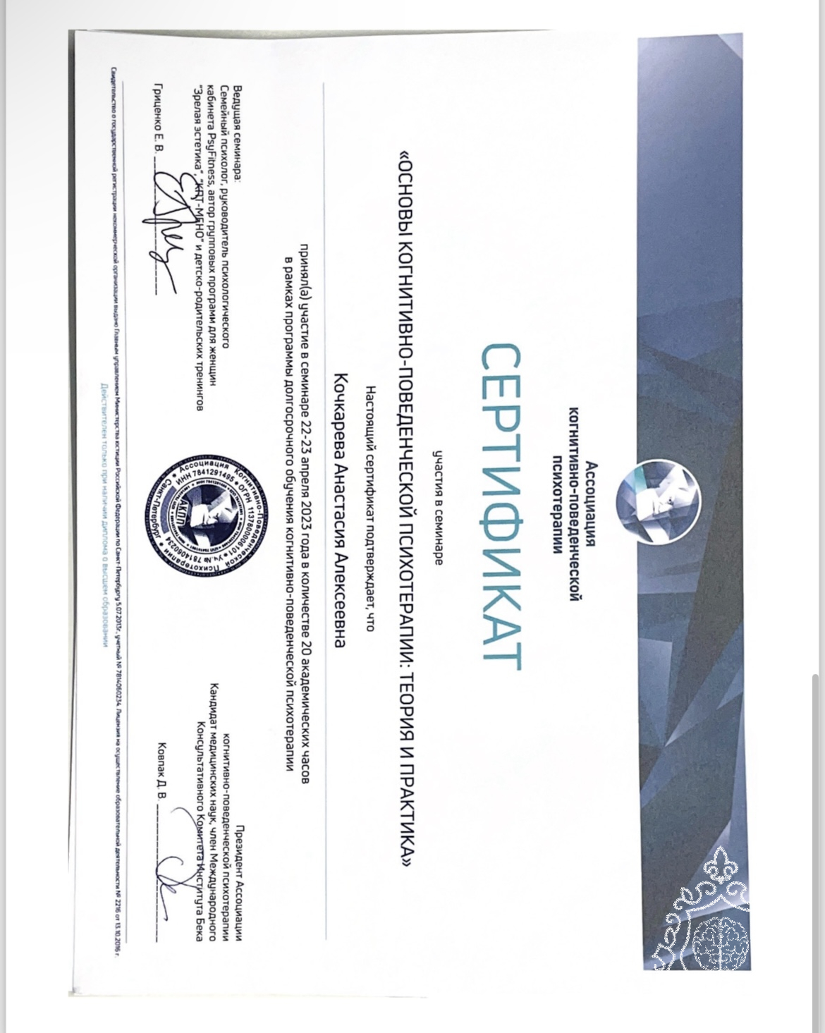 В своей практике я использую инструменты научно доказанной когнитивно-поведенческой терапии и личностно-ориентированной реконструктивной психотерапии. Сочетание этих двух методов позволяет работать в комплексе: и с симптомом, и с личностью, что повышает эффективность терапии.