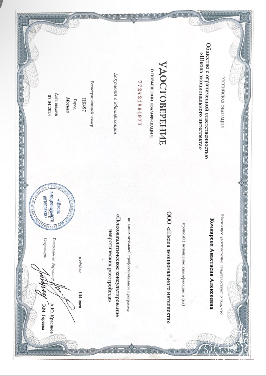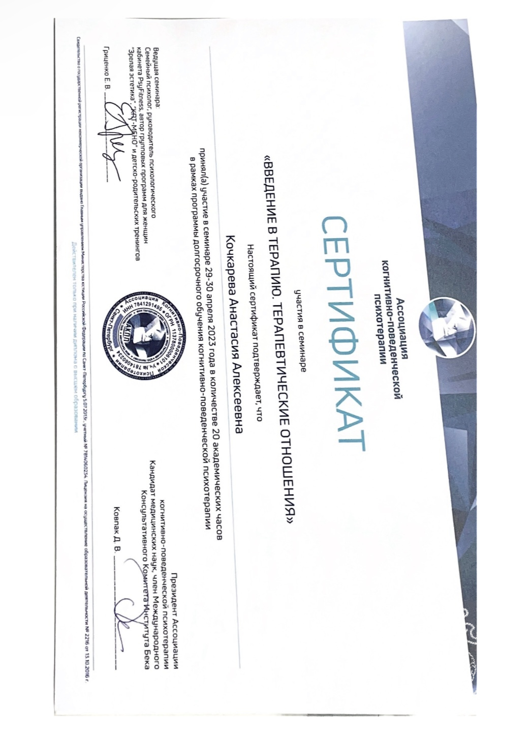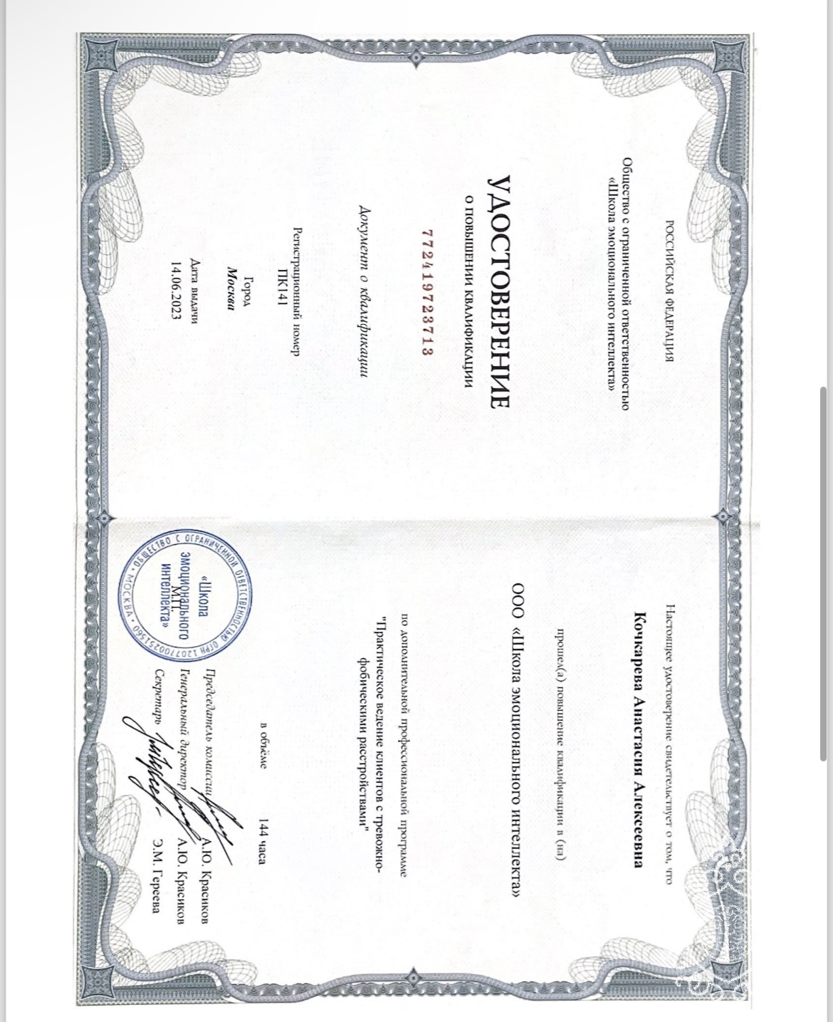 В своей практике я использую инструменты научно доказанной когнитивно-поведенческой терапии и личностно-ориентированной реконструктивной психотерапии. Сочетание этих двух методов позволяет работать в комплексе: и с симптомом, и с личностью, что повышает эффективность терапии.