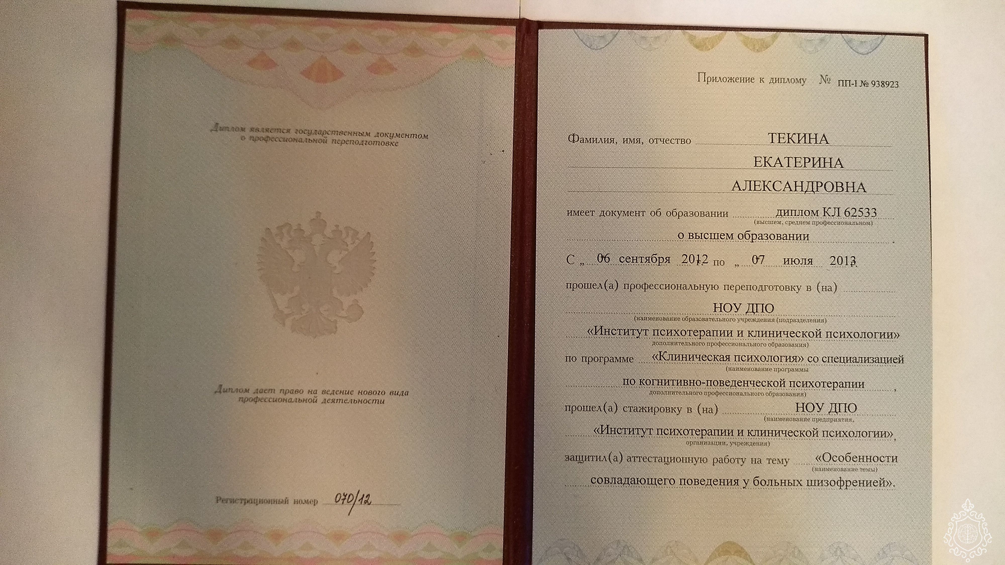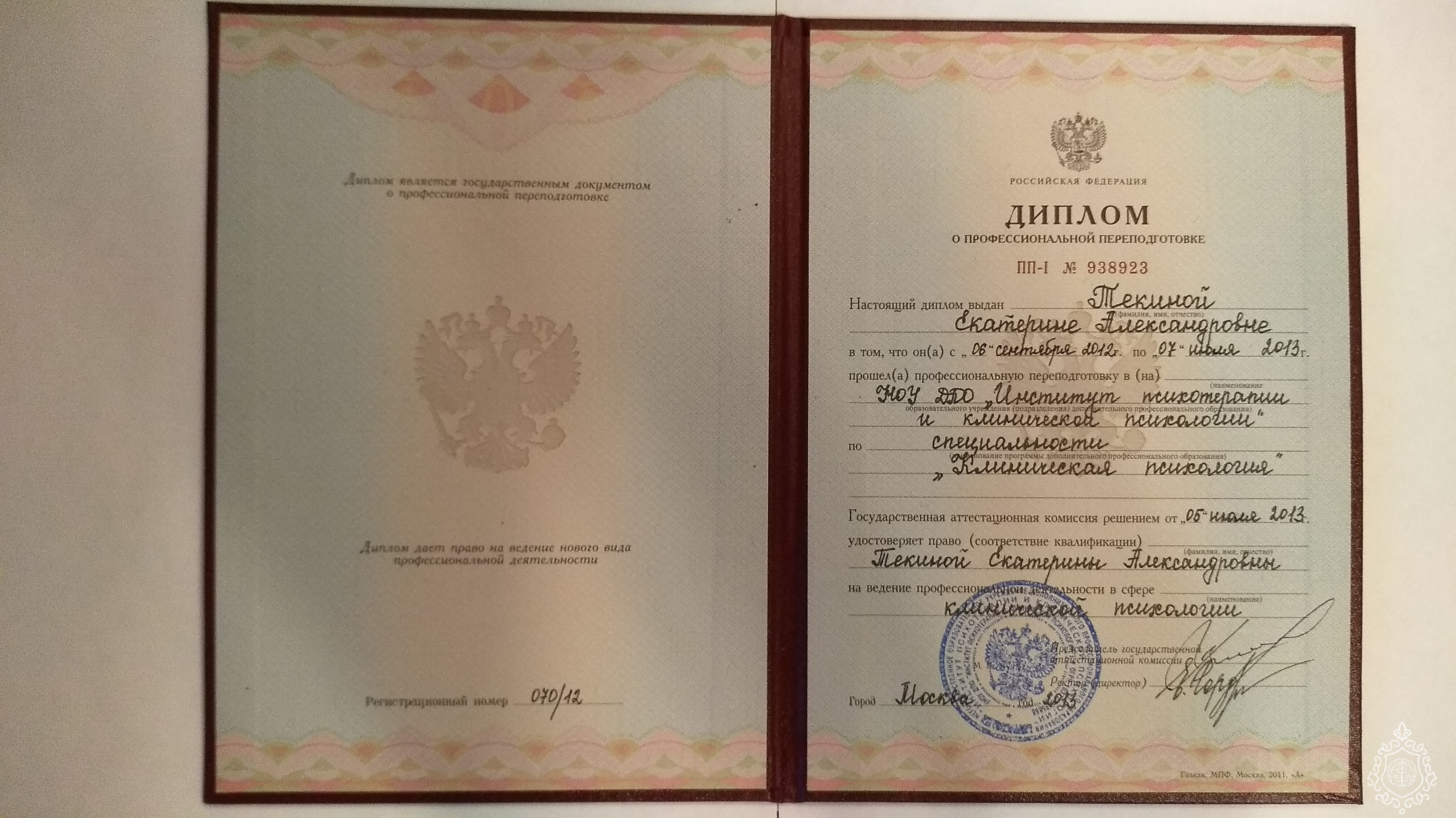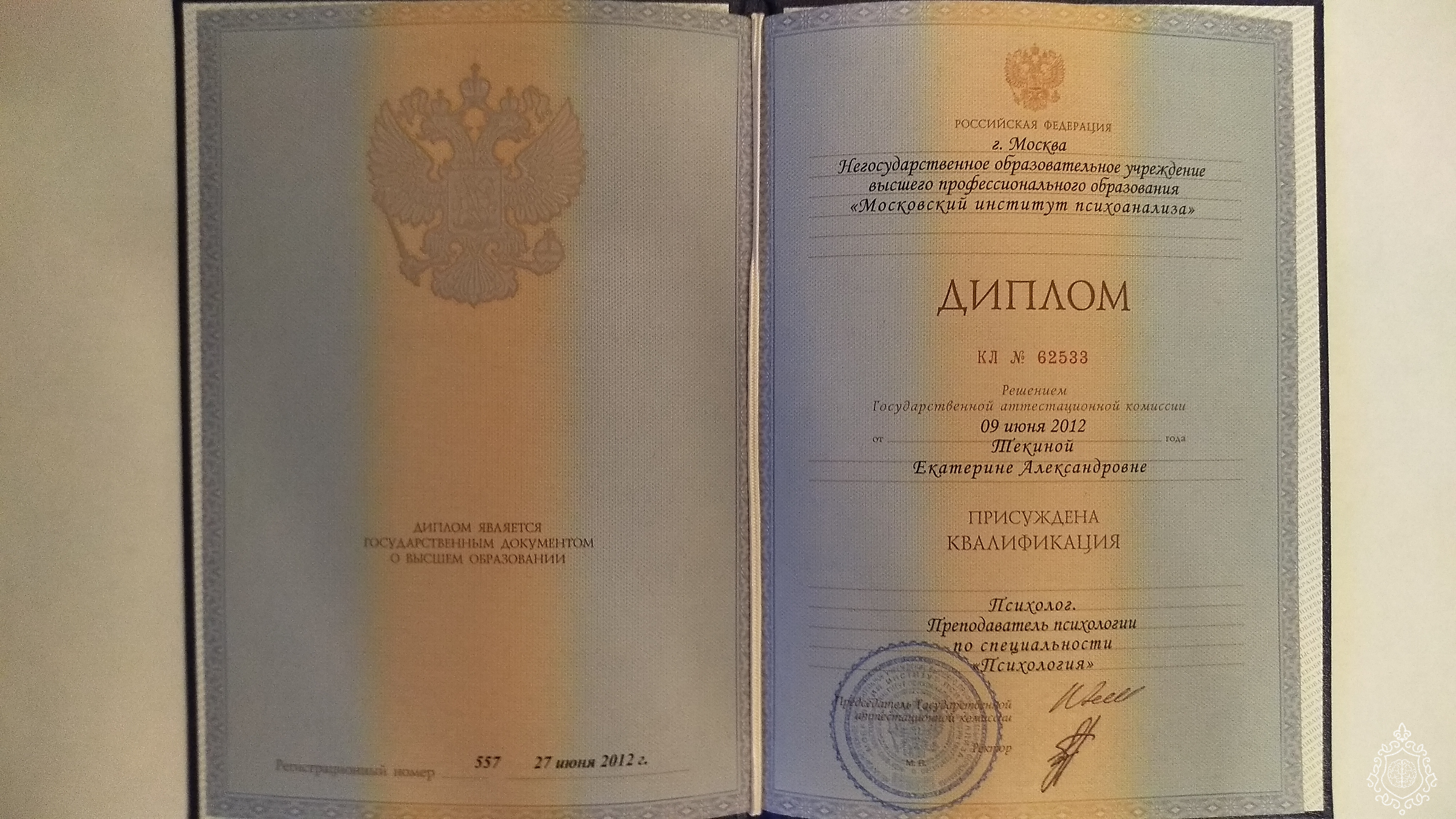Специальность - Психолог. Преподаватель психологии. Во время обучения специализировалась по клинической (медицинской) психологии (2012г).