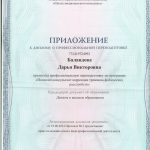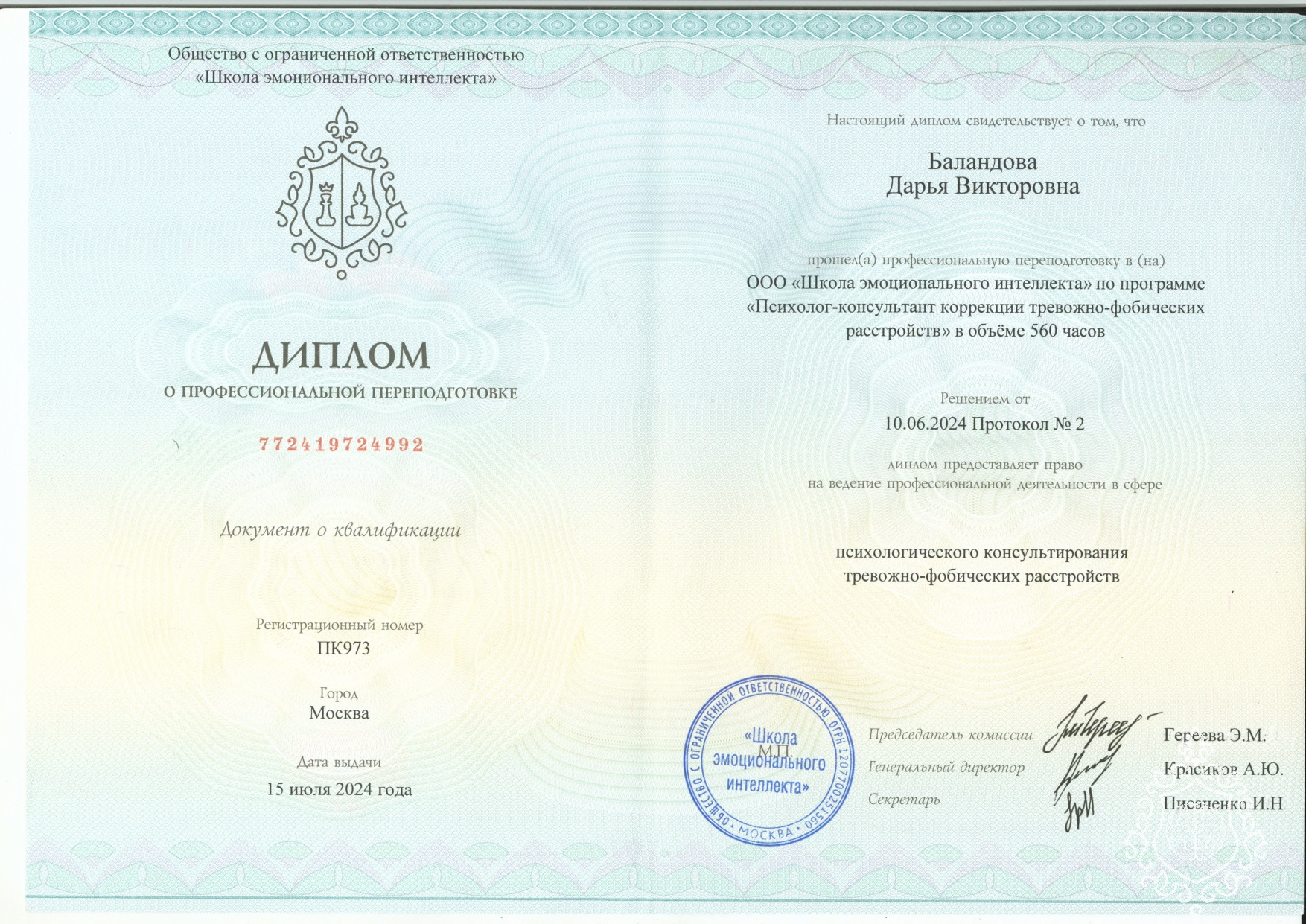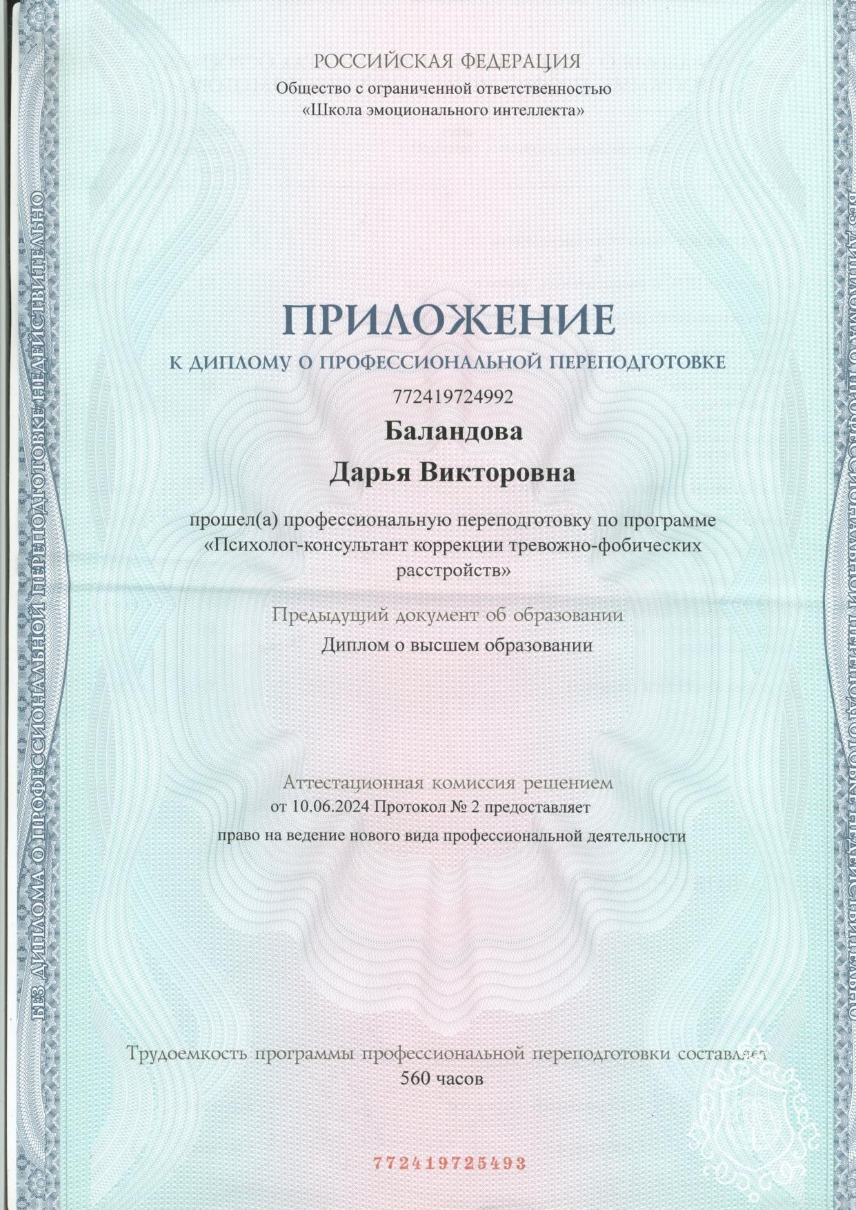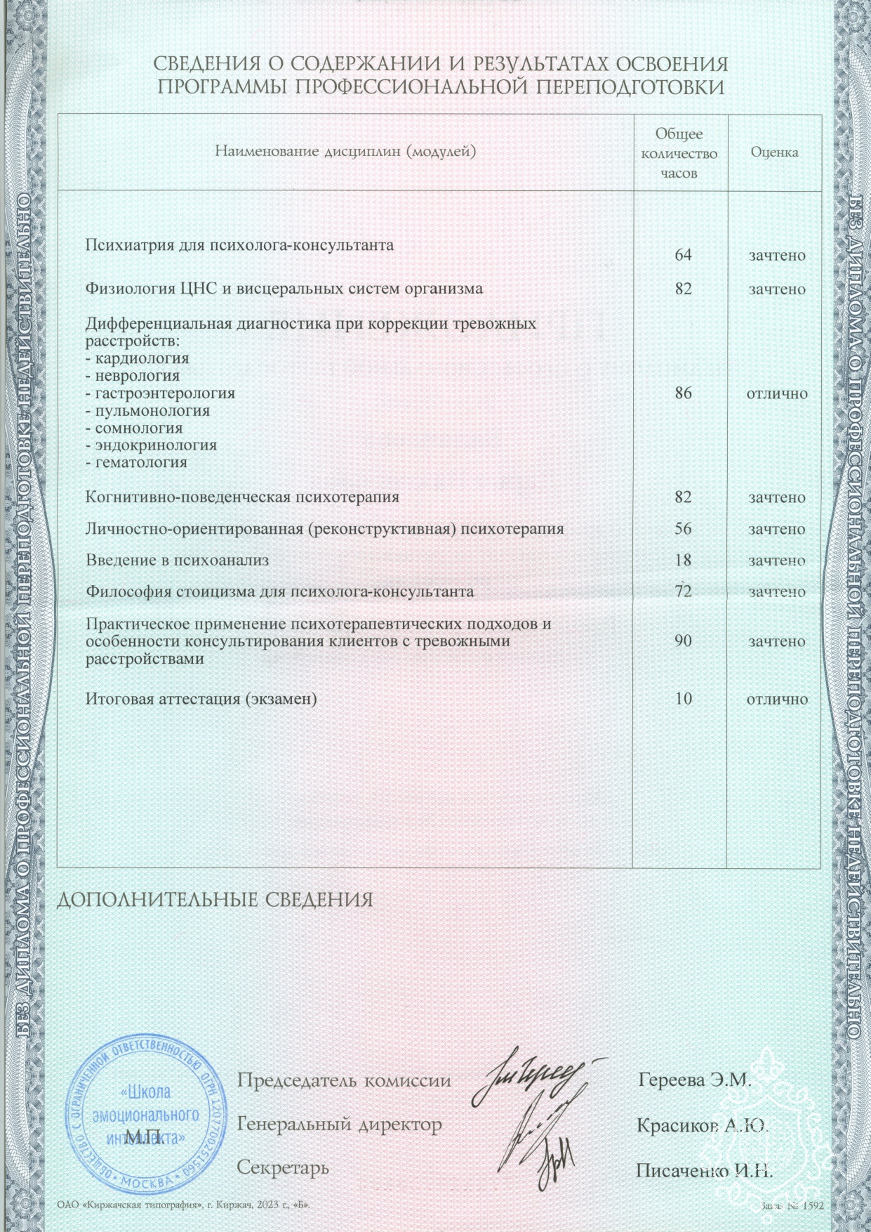 — Школа эмоционального интеллекта, г. Москва — психолог-консультант коррекции тревожно-фобических расстройств (2024 г.)— Международный институт развития когнитивно-поведенческой терапии, г. Санкт-Петербург — КПТ (2024 г.)