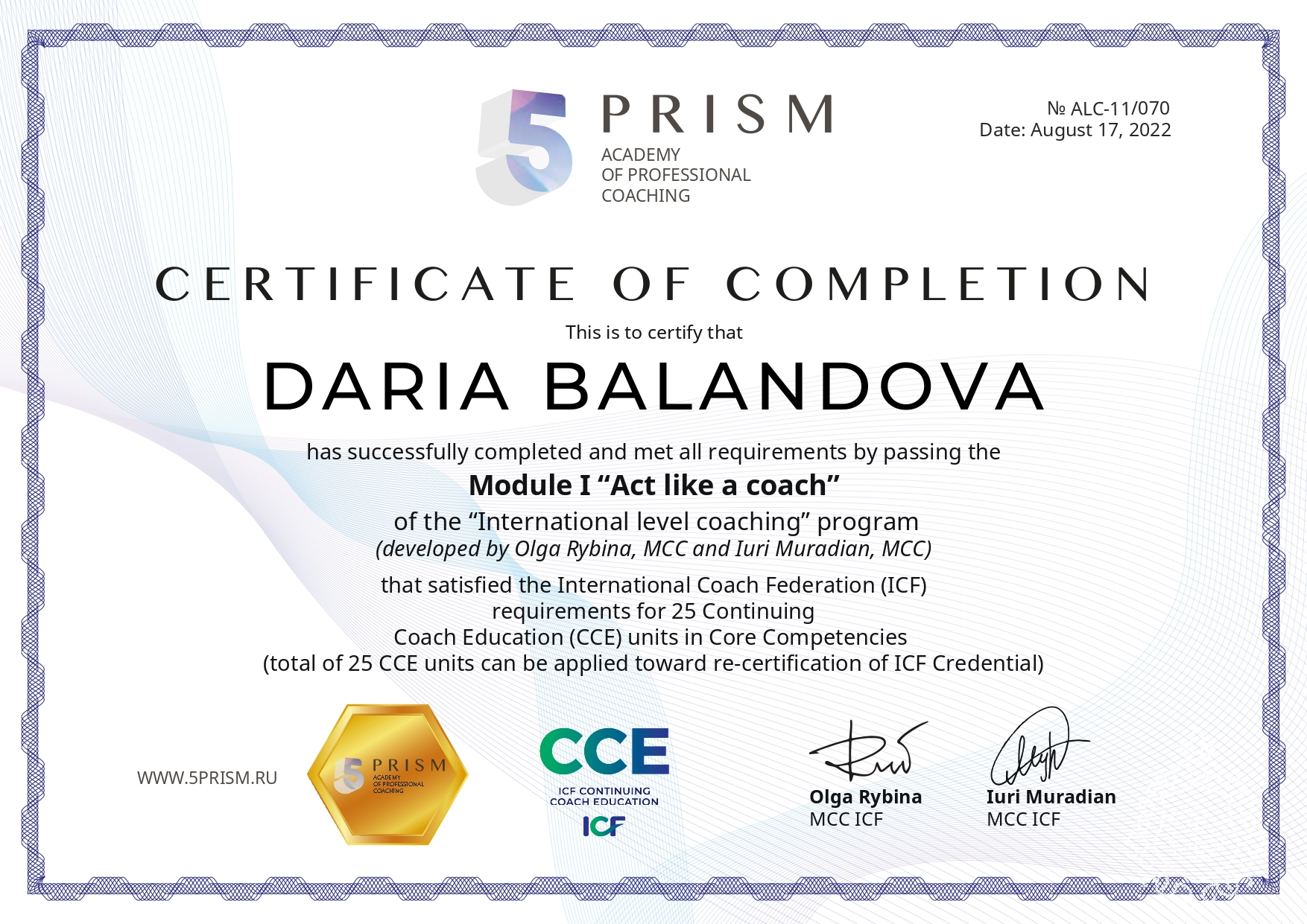 — Международная академия профессионального коучинга 5 Призм, г. Санкт-Петербург — Коуч CCE ICF (2022 г.)