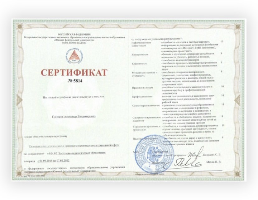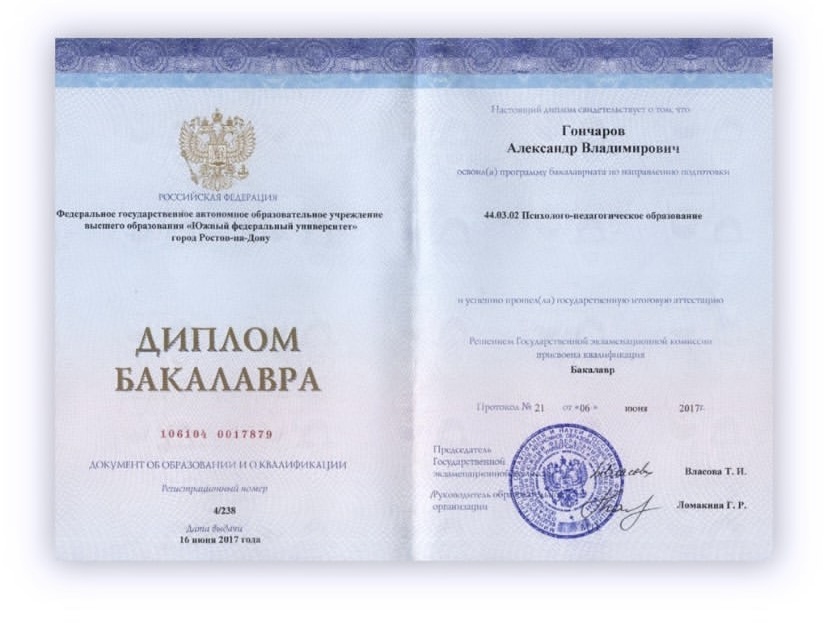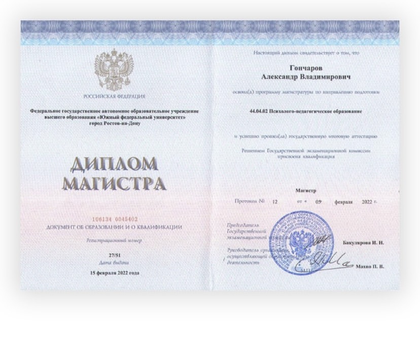 Окончил бакалавриат и магистратуру в Академии психологии и педагогики "Южного Федерального Университета"