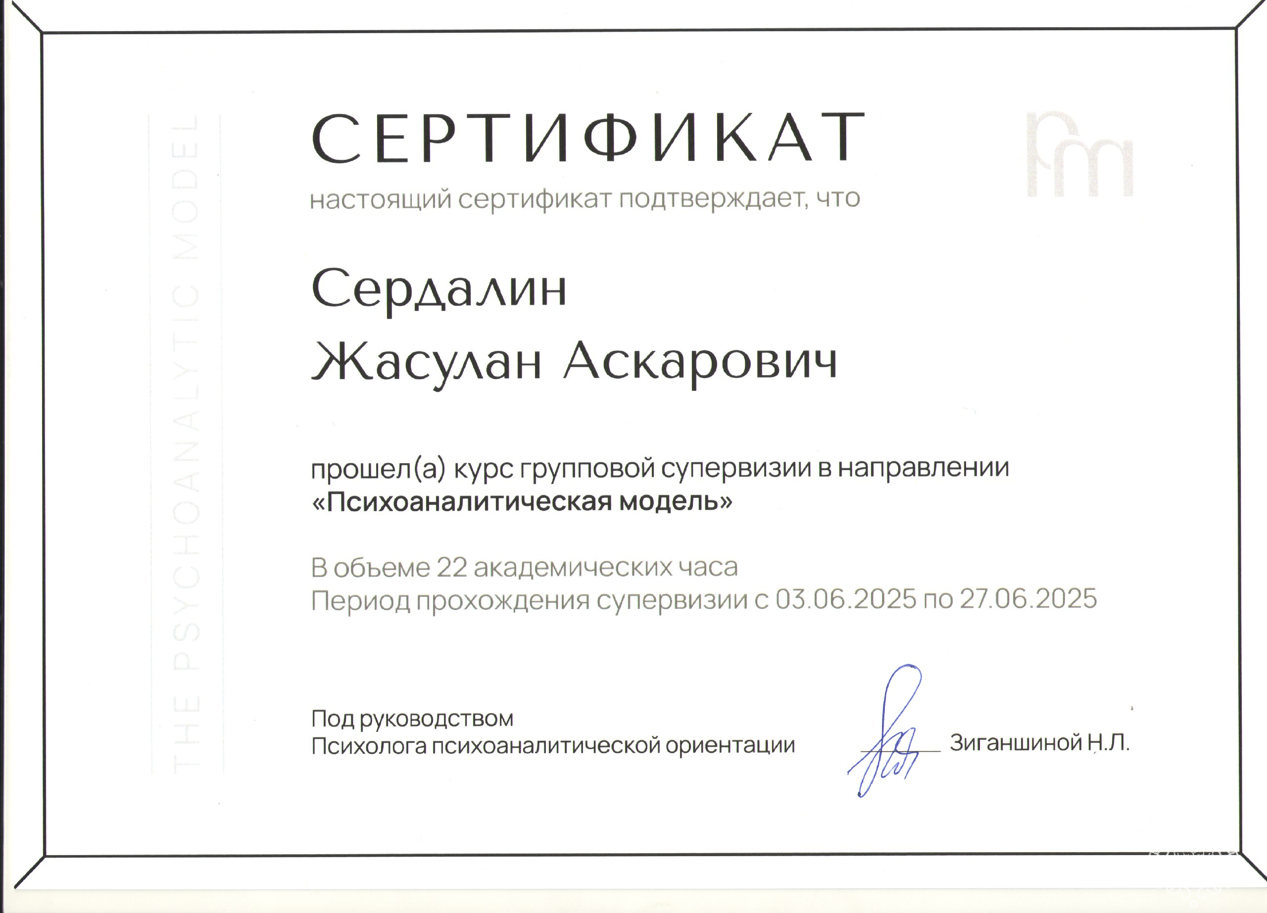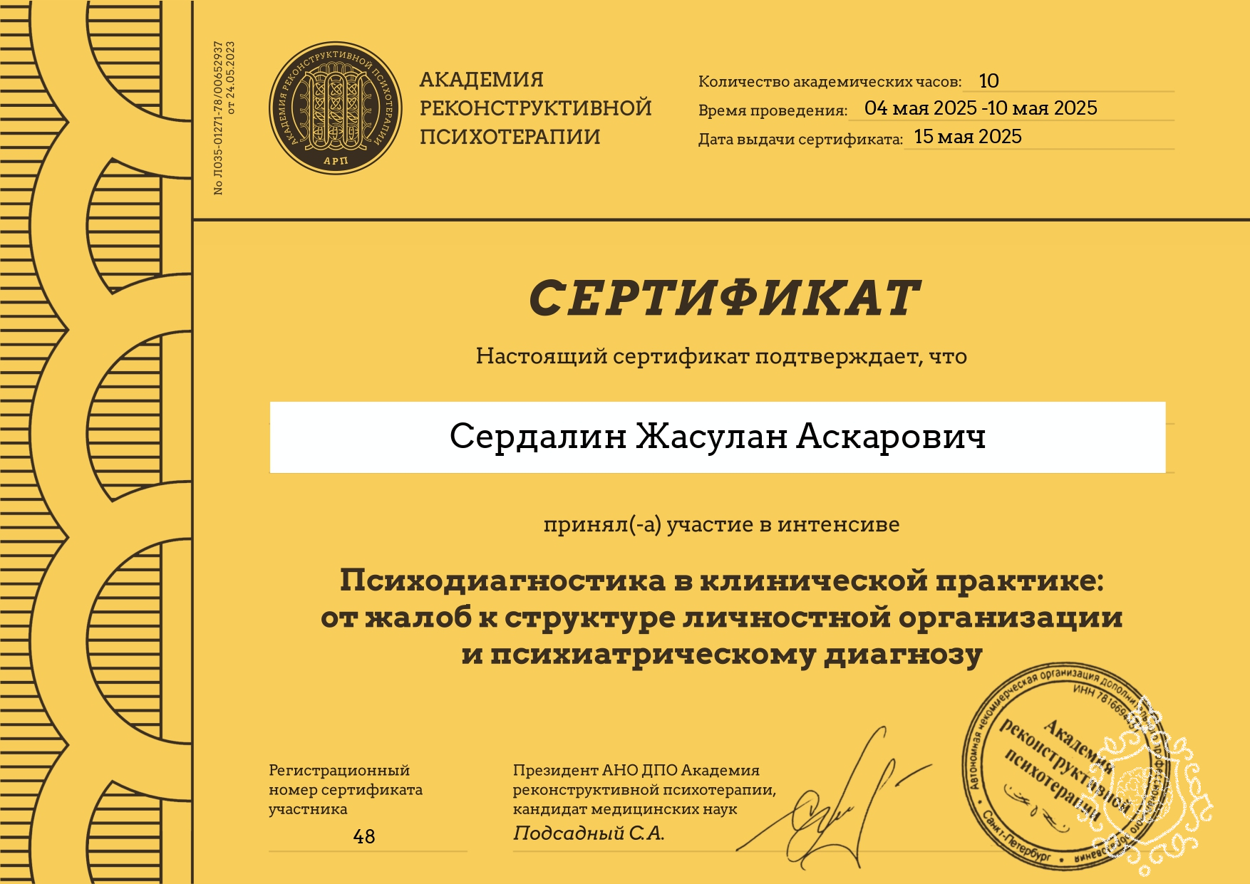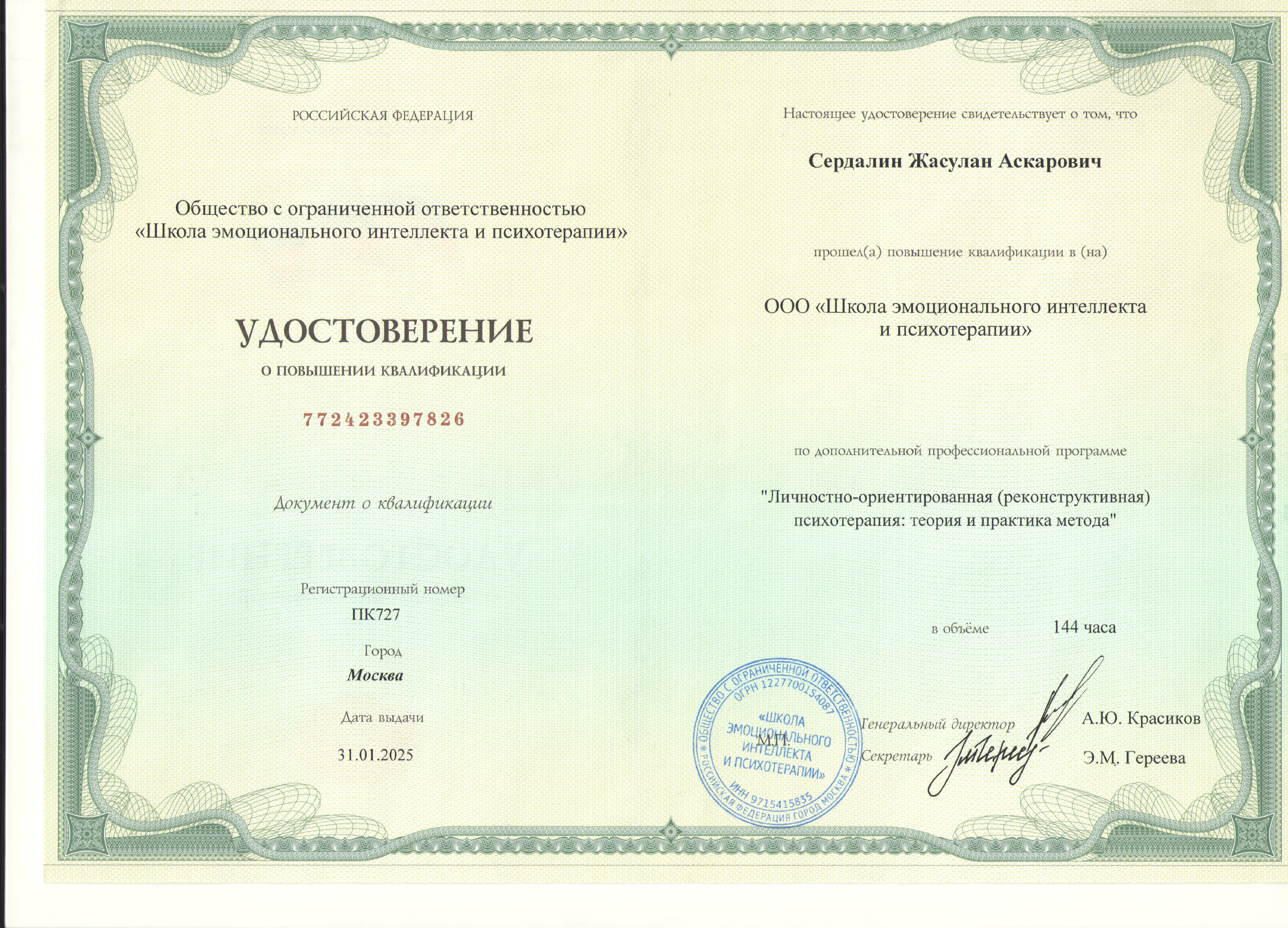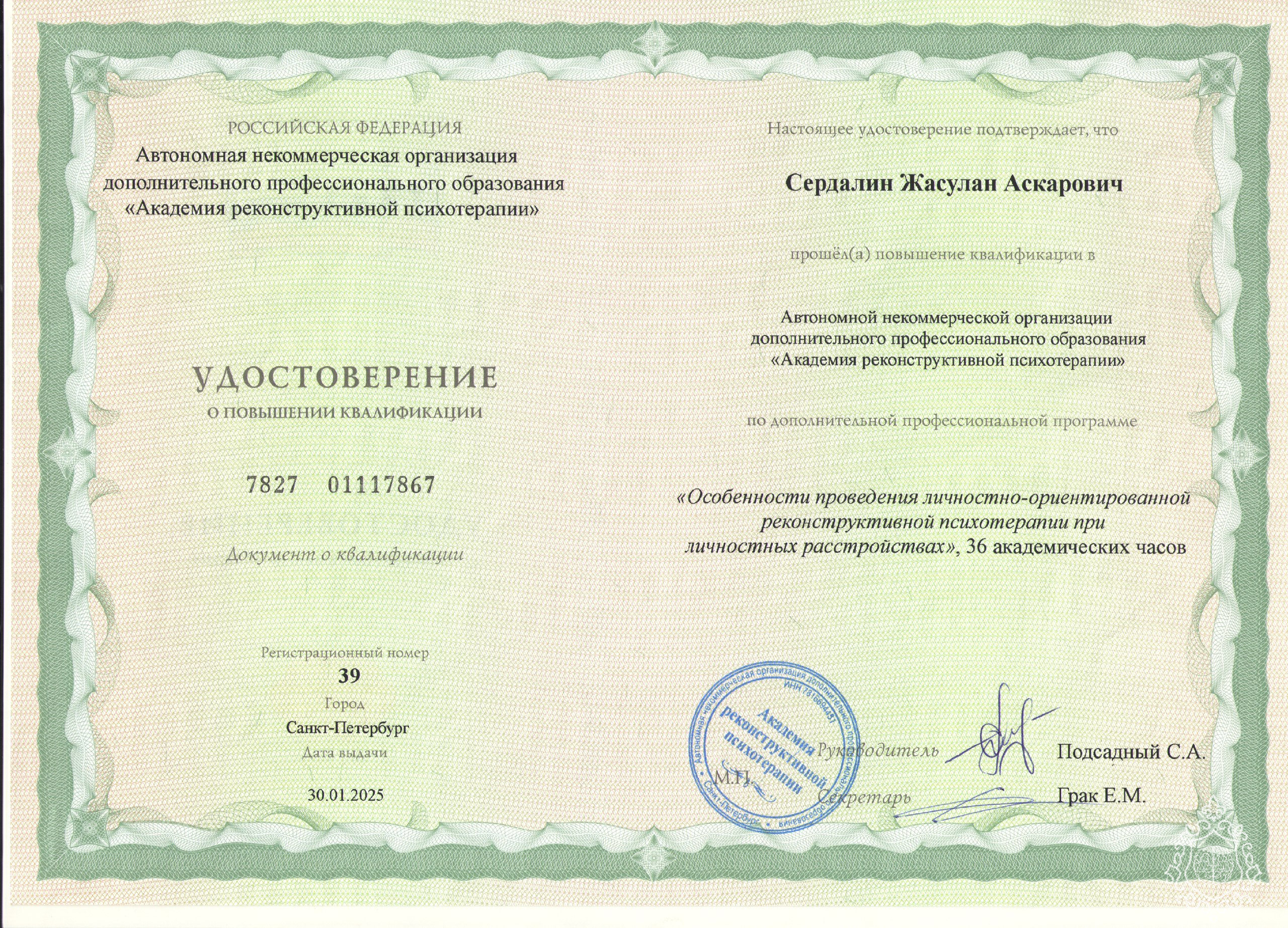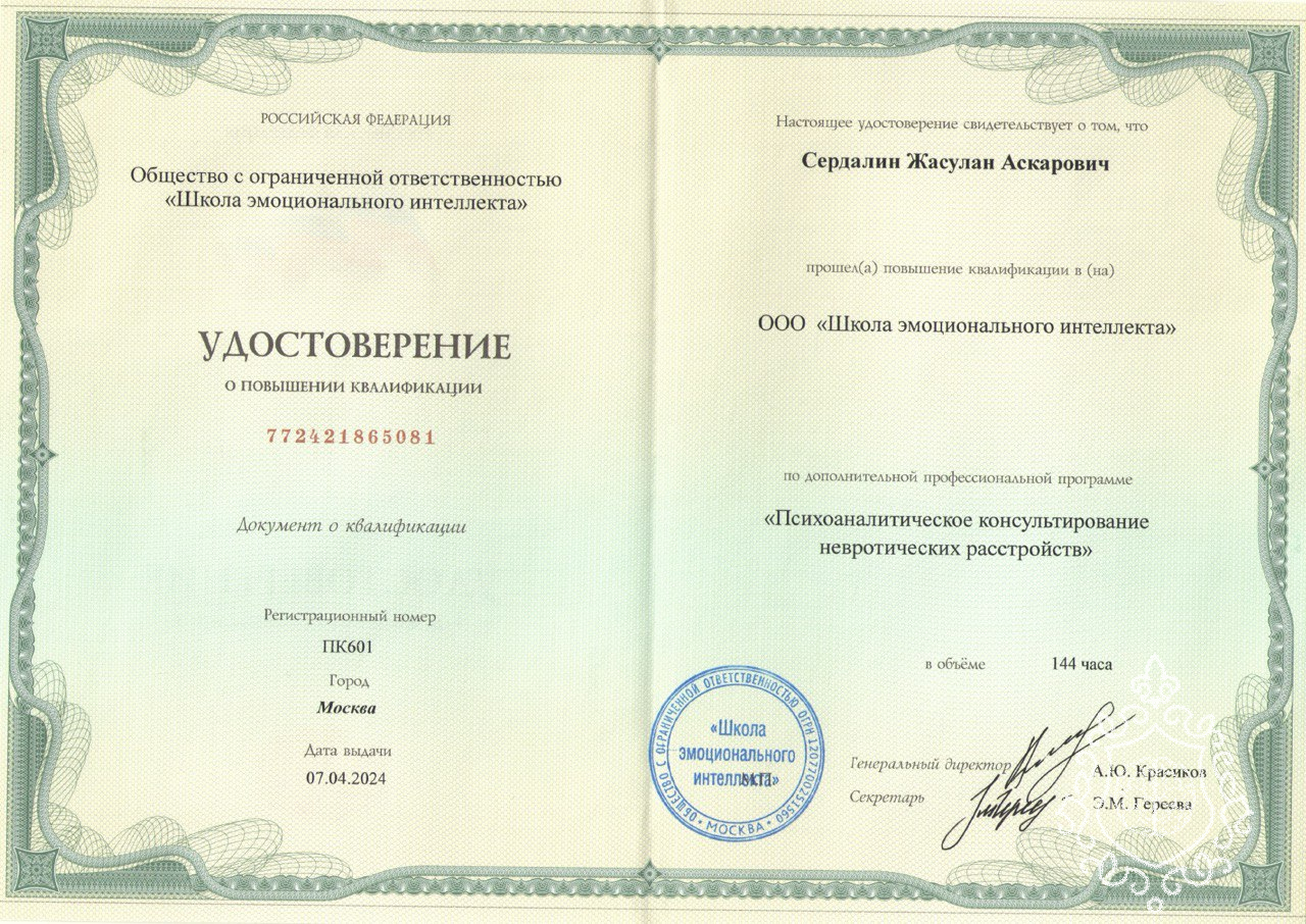 Помимо основного обучения, получил 4 повышения квалификации по научно-доказанным методам психотерапии: ЛОРПт - от ШЭИиП и дополнительно от Академии реконструктивной психотерапии, также по Психоанализу и Транзактному анализу.