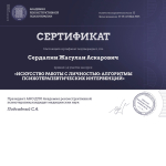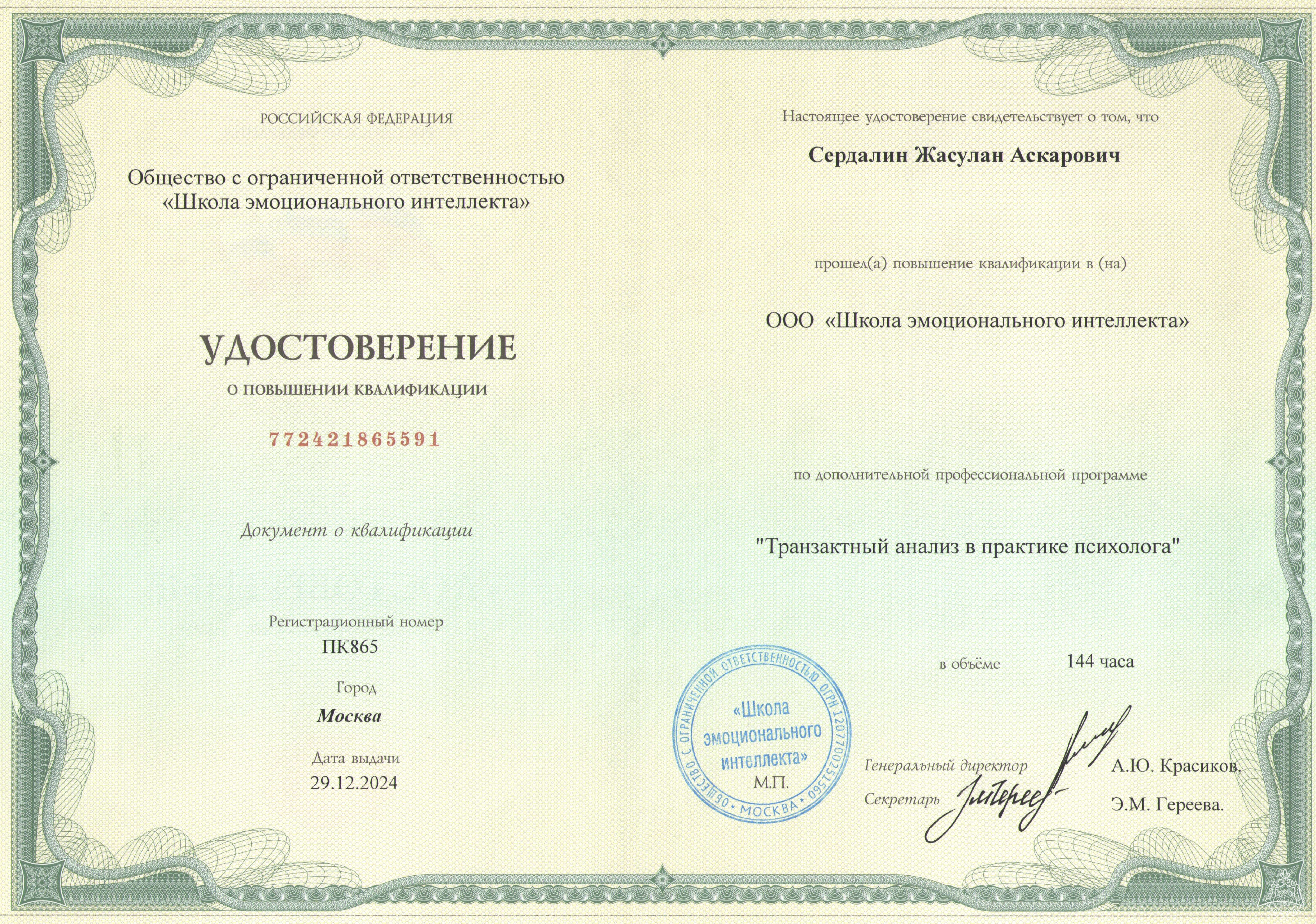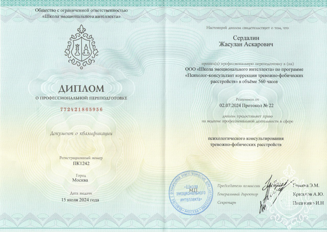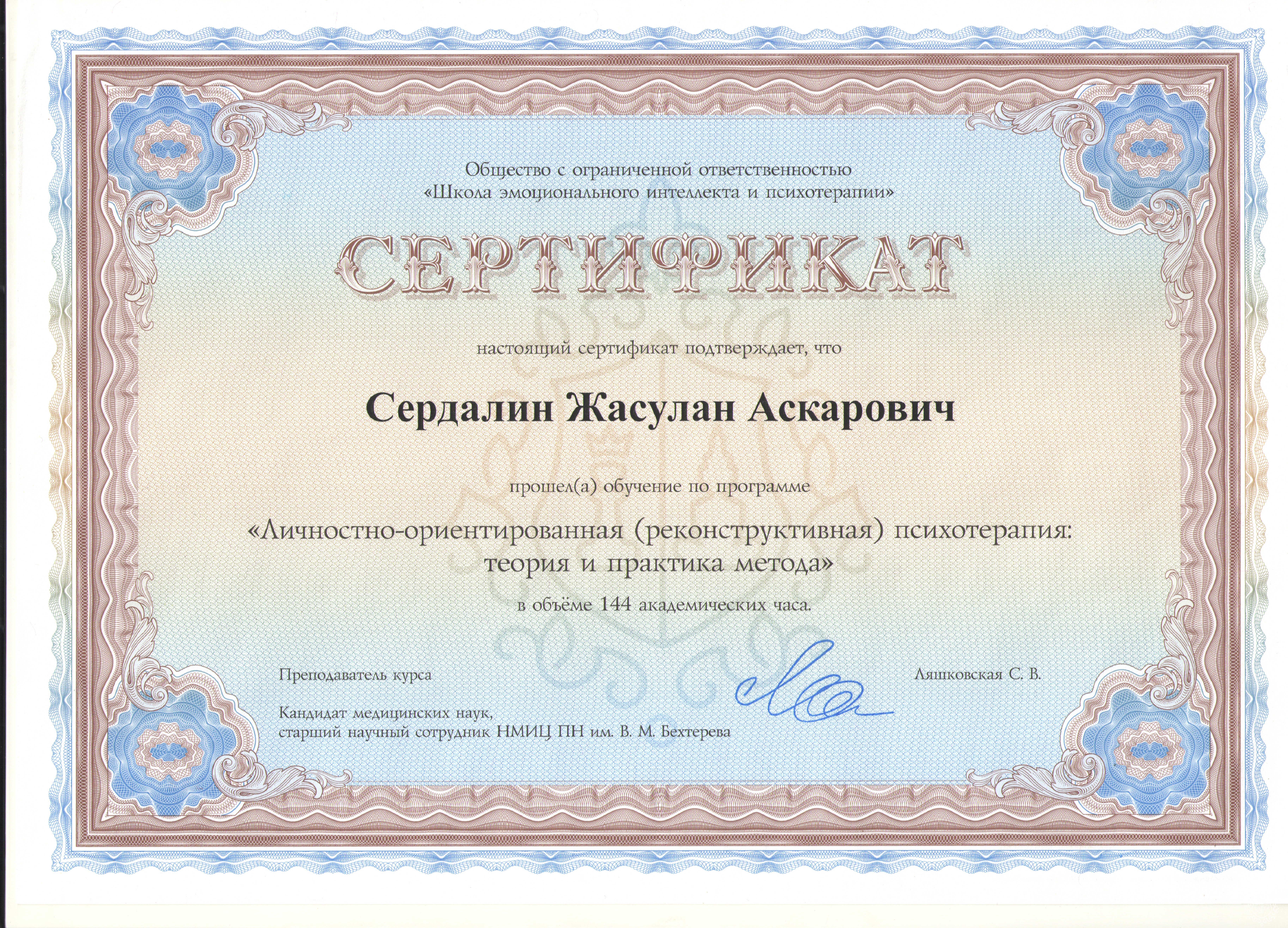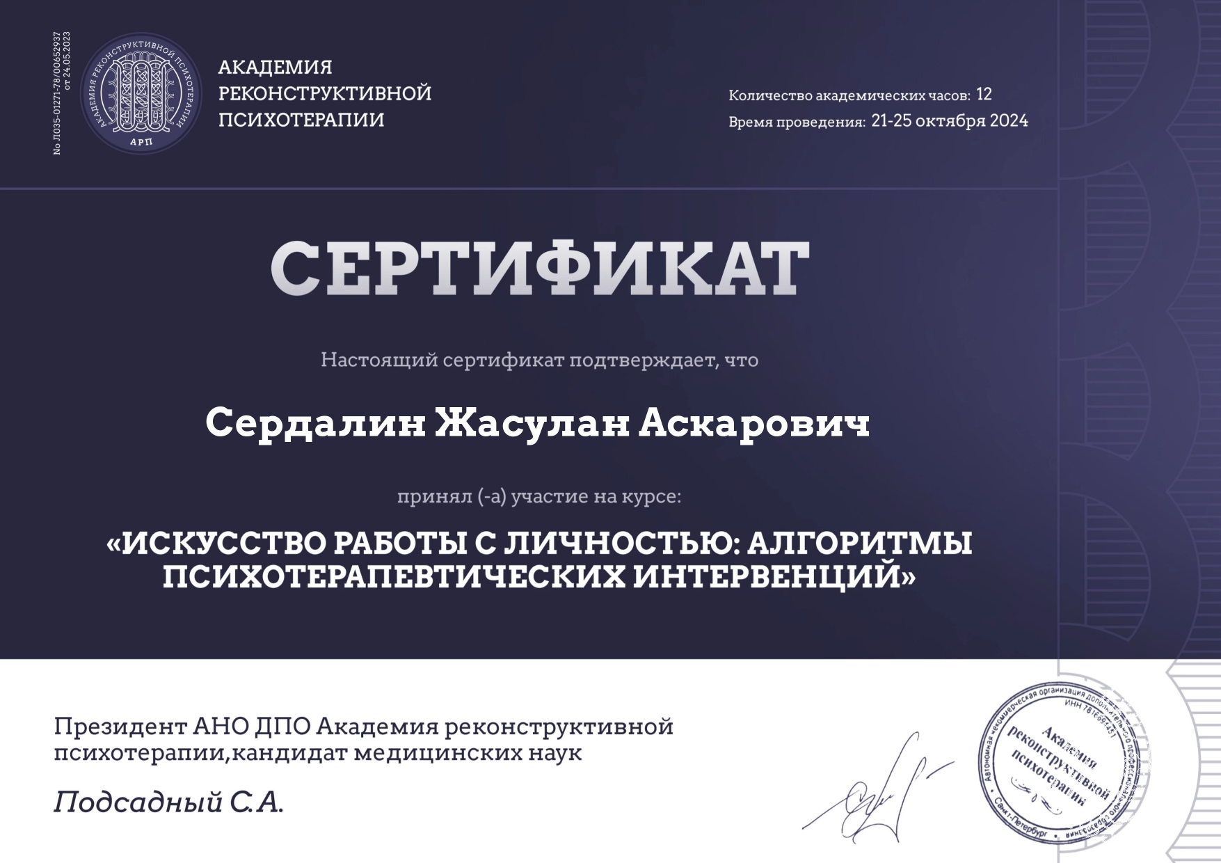 Помимо основного обучения, получил 4 повышения квалификации по научно-доказанным методам психотерапии: ЛОРПт - от ШЭИиП и дополнительно от Академии реконструктивной психотерапии, также по Психоанализу и Транзактному анализу.