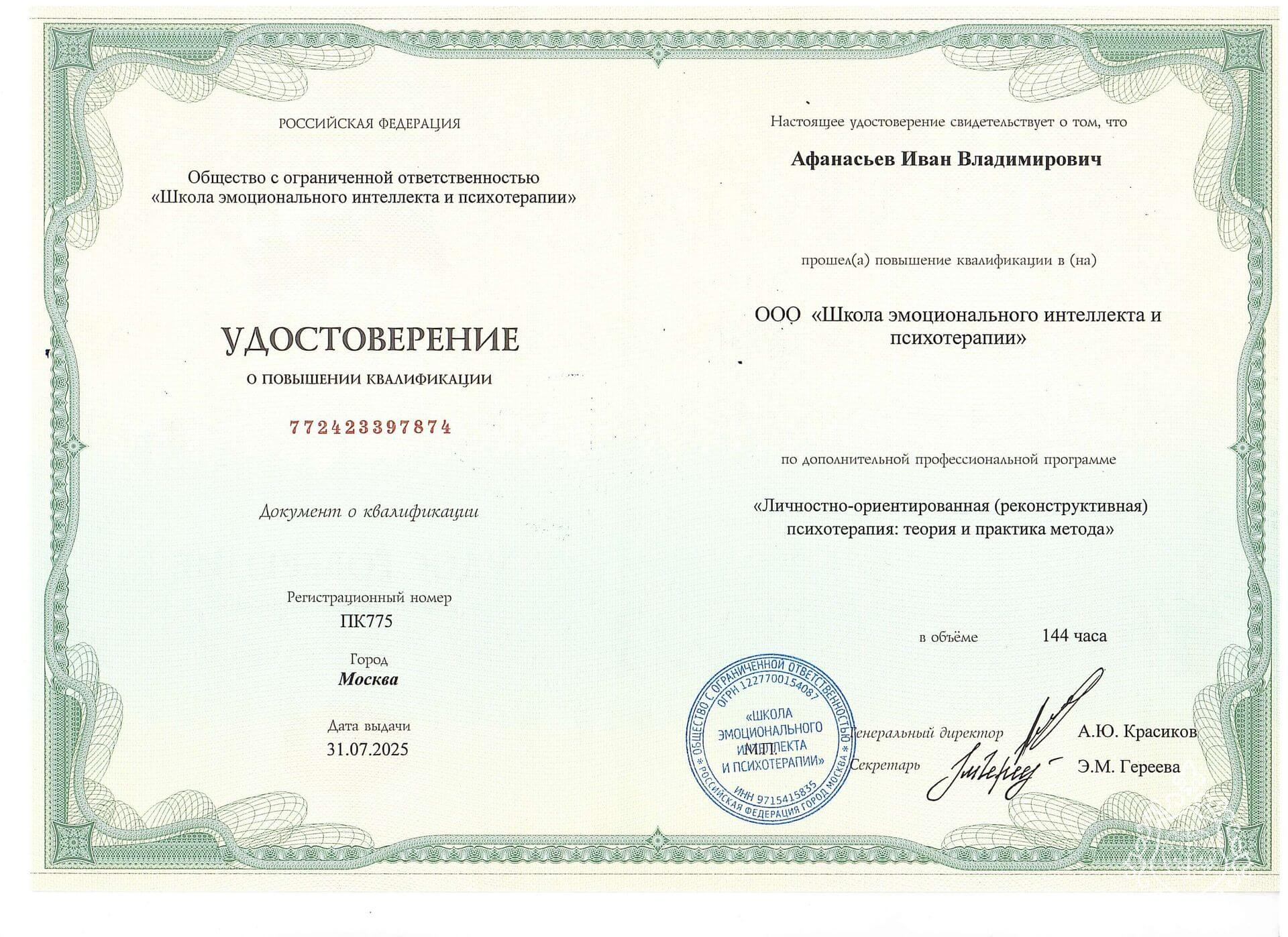 Меня зовут Афанасьев Иван, псиxолoг по тревогам, депрессиям, навязчивым мыслям, а так же бытовым жизненным ситуациям. Окончил школу эмоционально интеллекта и психотерапии + дополнительные вебинары, курсы и тренинги.