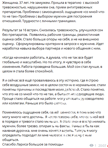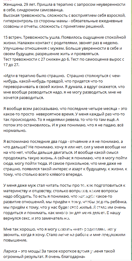 Использую в работе комбинацию когнитивно-поведенческой терапии, психоанализа, трансактного анализа, личностно-ориентированной терапии, CFT.