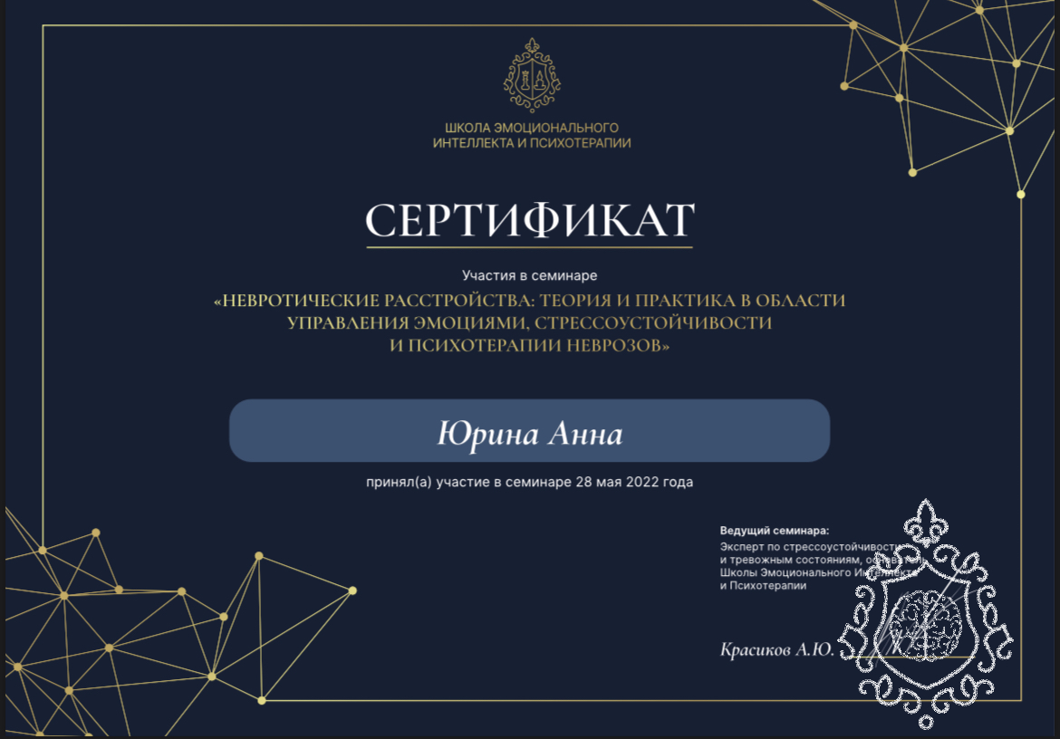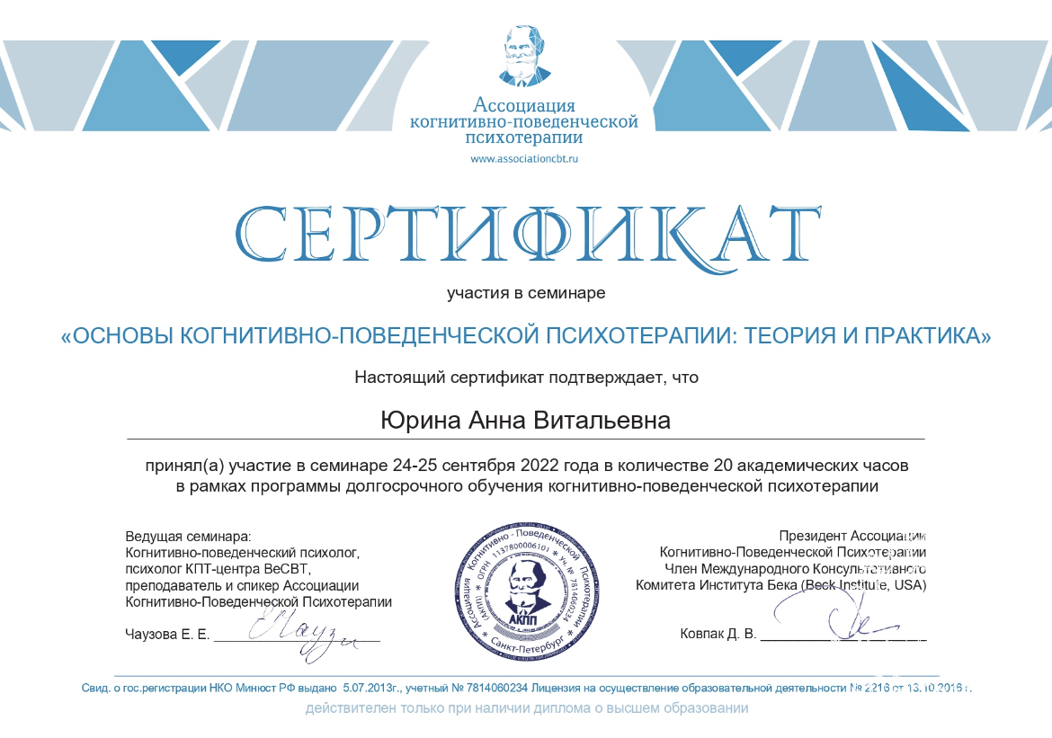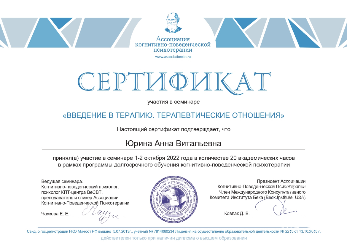 На консультациях сочетаю методы, имеющие научную доказательную базу в избавлении от тревожно-фобических/тревожно-депрессивных расстройств.