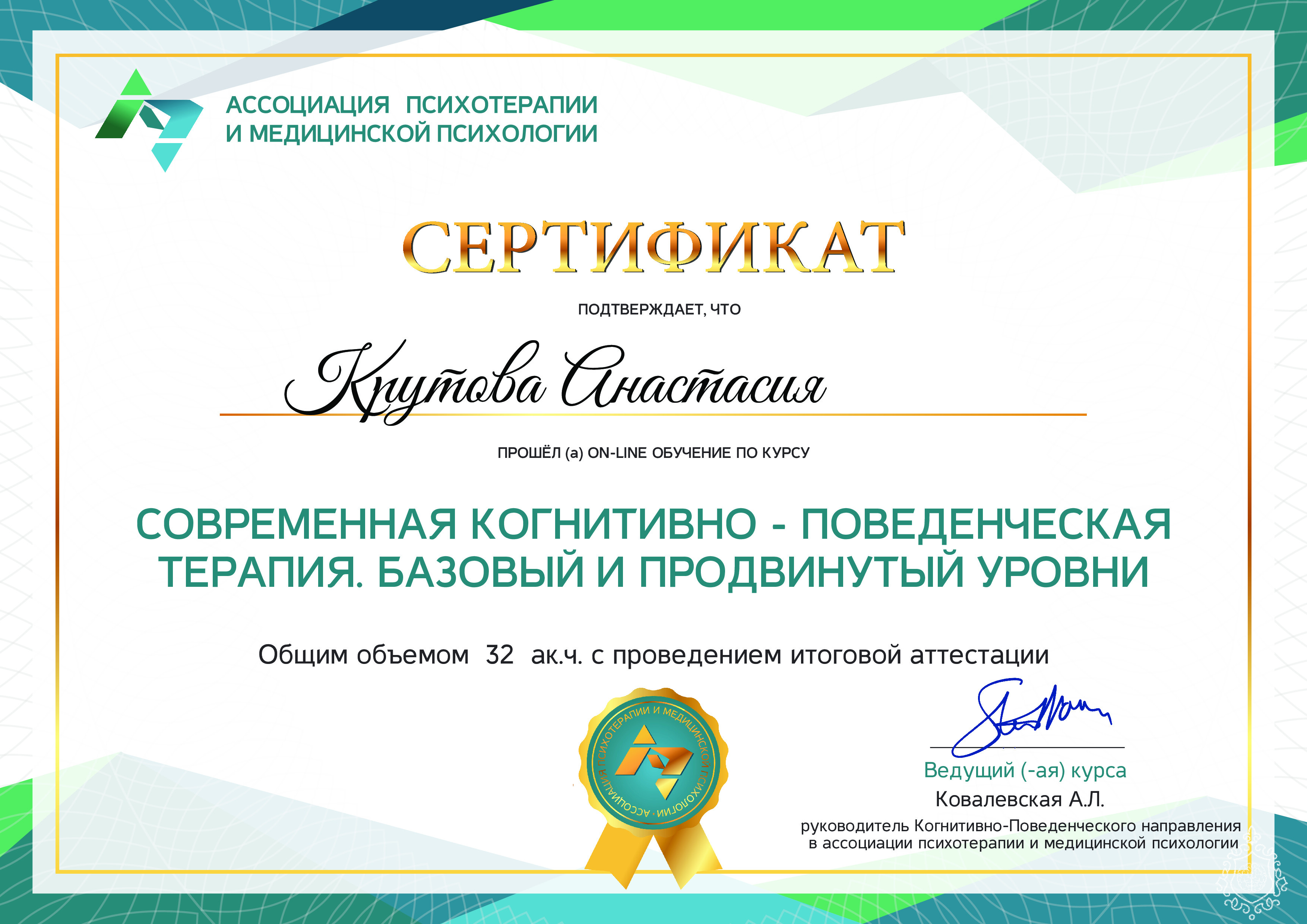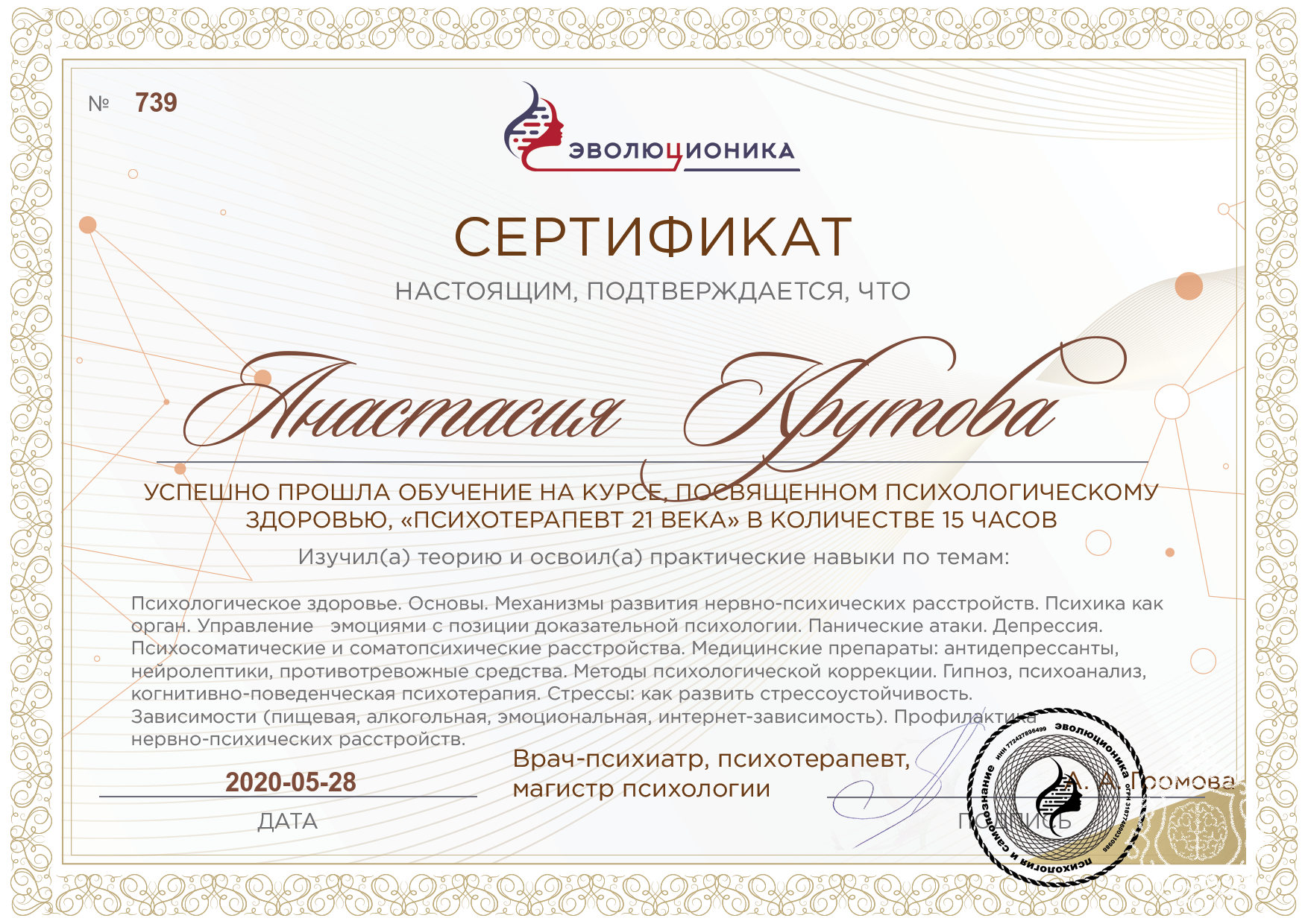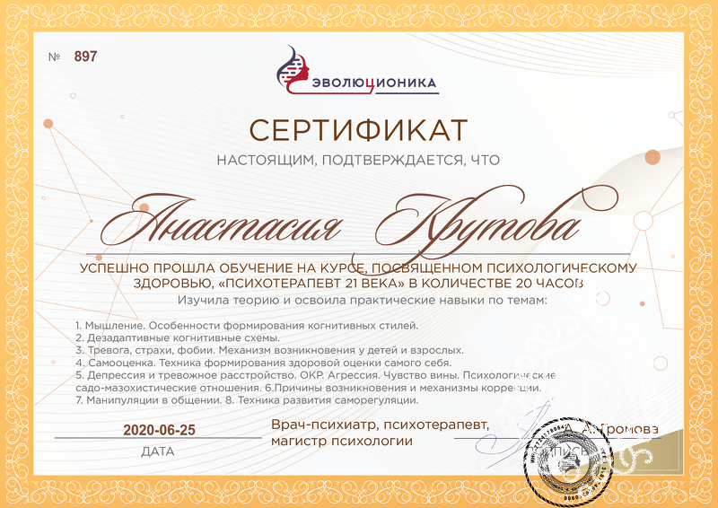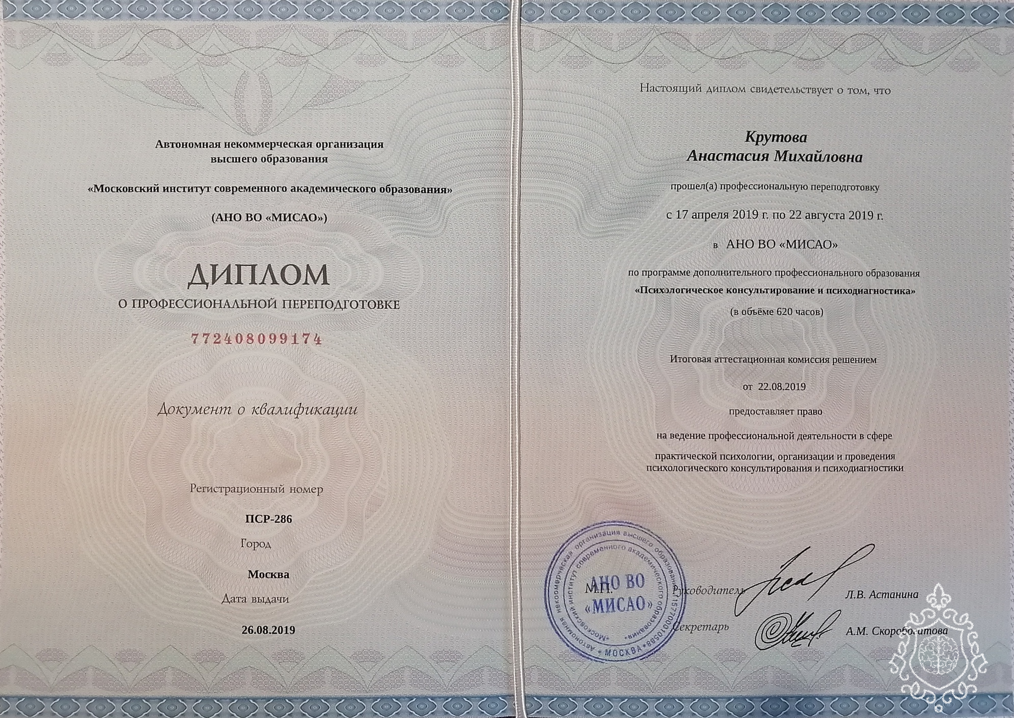 Я - Крутова Анастасия, практикующий психолог-консультант по коррекции тревожно-фобических расстройств. Занимаюсь частной практикой индивидуальных консультаций с 2019 года. В основном работаю с тревогой и тревожными состояниями. Формат работы: ОНЛАЙН.