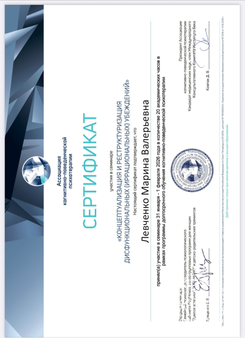 Приветствую тебя, мой друг. Если ты столкнулся с различными видами тревог, фобий, панических расстройств, депрессий и с недопониманием, возможно, со стороны окружающих, знай: ты не одинок в своей проблеме! Я также, как и ты прошла этот трудный путь тревожного расстройства, испытала на себе все "прелести" панических атак, множественных экстрасистол, страхов за здоровье и многое другое. Поэтому с радостью стану проводником от мира панических атак, различных фобий, депрессий к миру без тревог. Личный опыт плюс профессиональный подход делает терапию эффективной. Применяемые методии: КПТ, ЛОРП, транзактный анализ.
