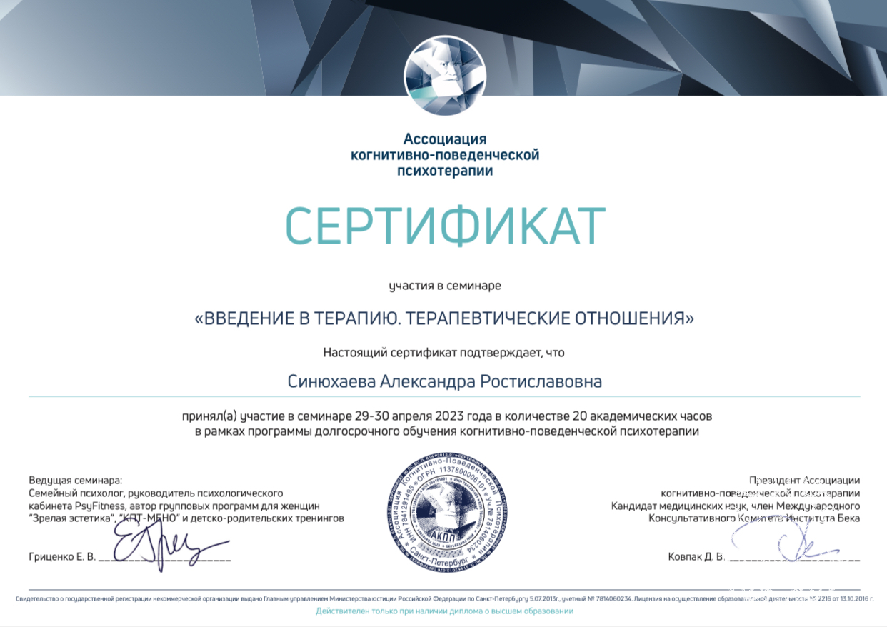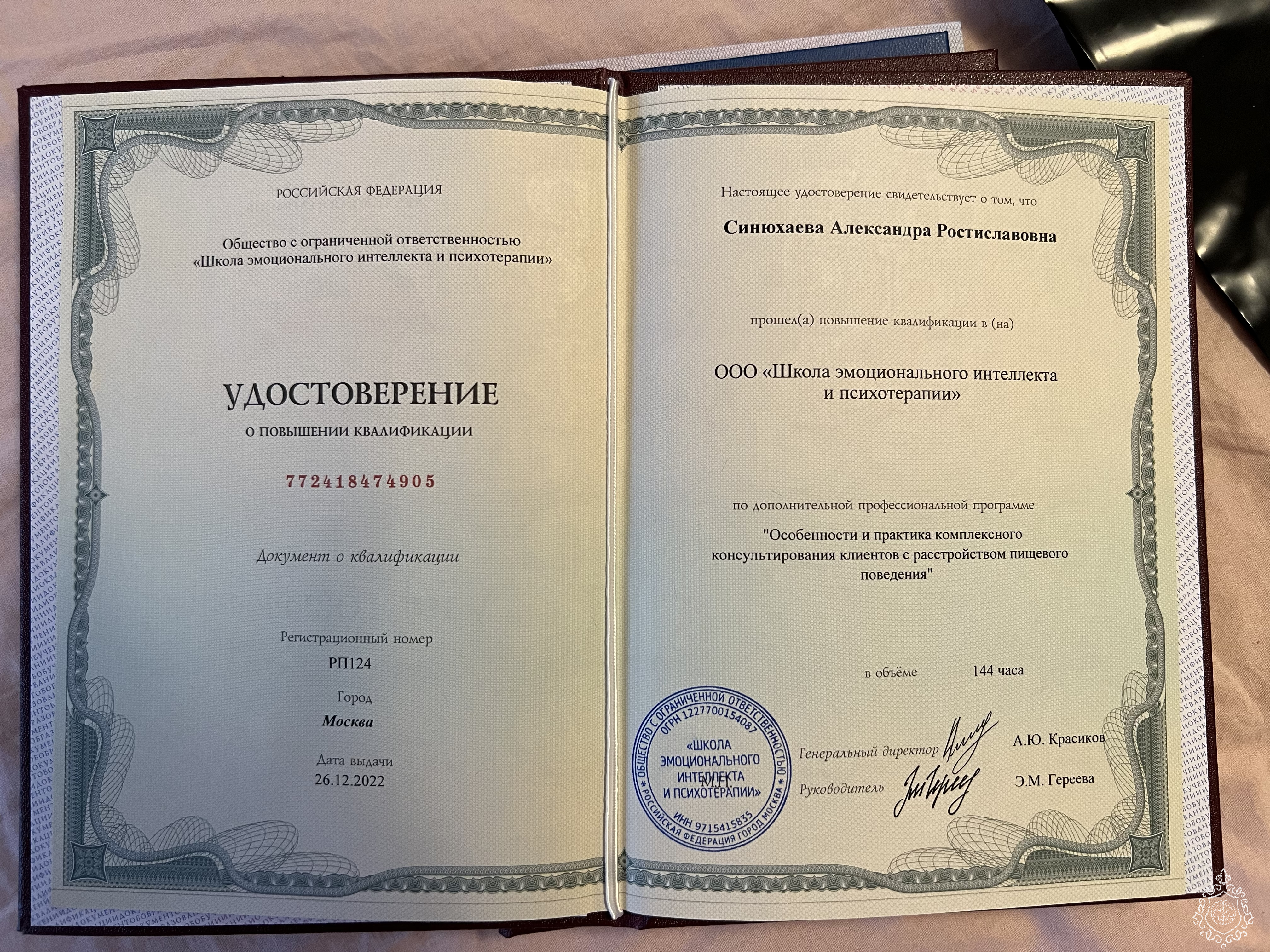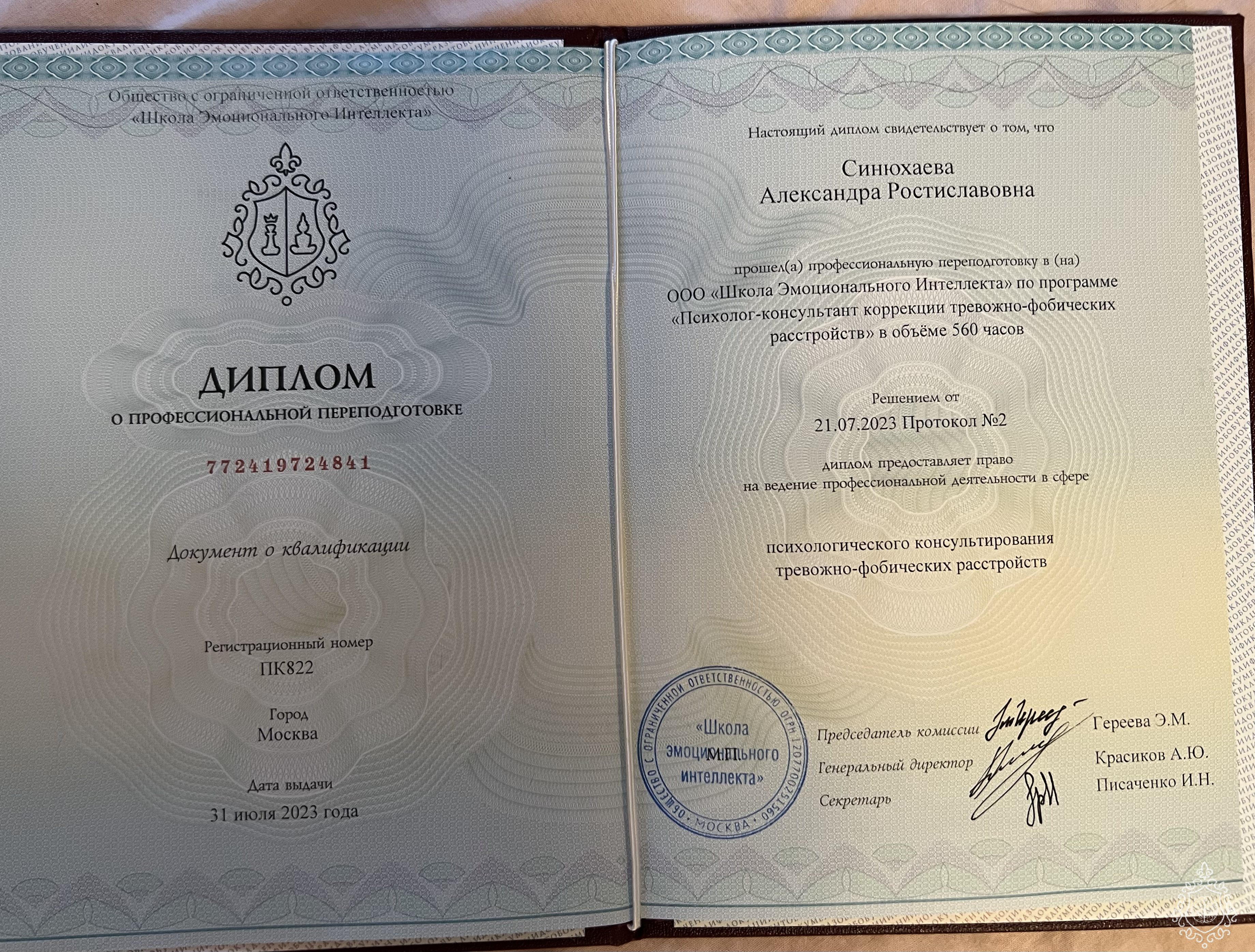 Образование: Школа Эмоционального Интеллекта и Психотерапии, выпускник 3 потока